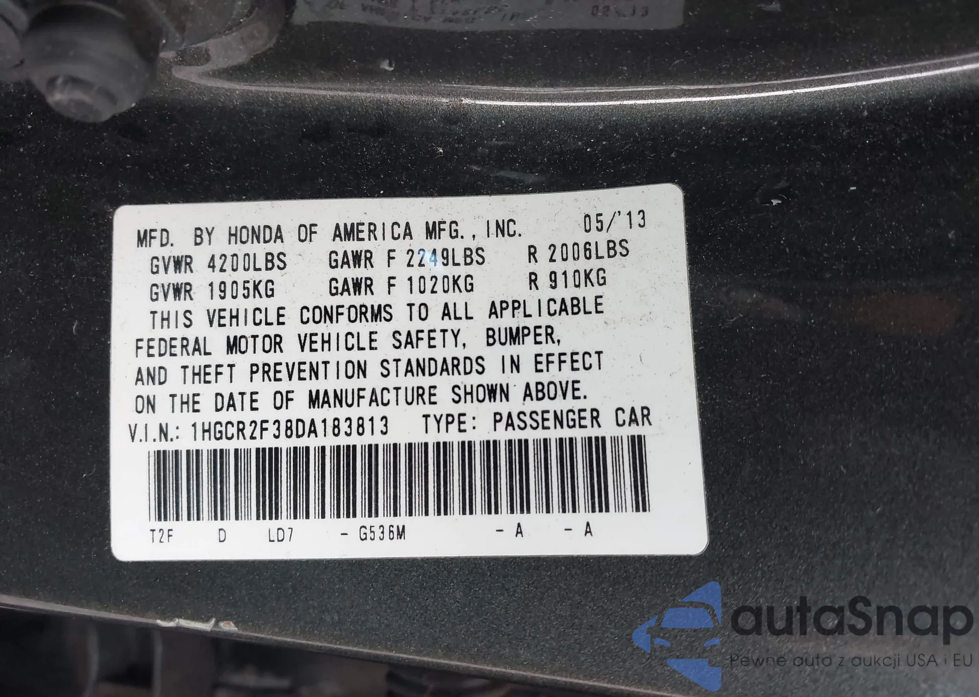 2013 Honda Accord Lx z USA, uszkodzony, nr VIN 1HGCR2F38DA183813