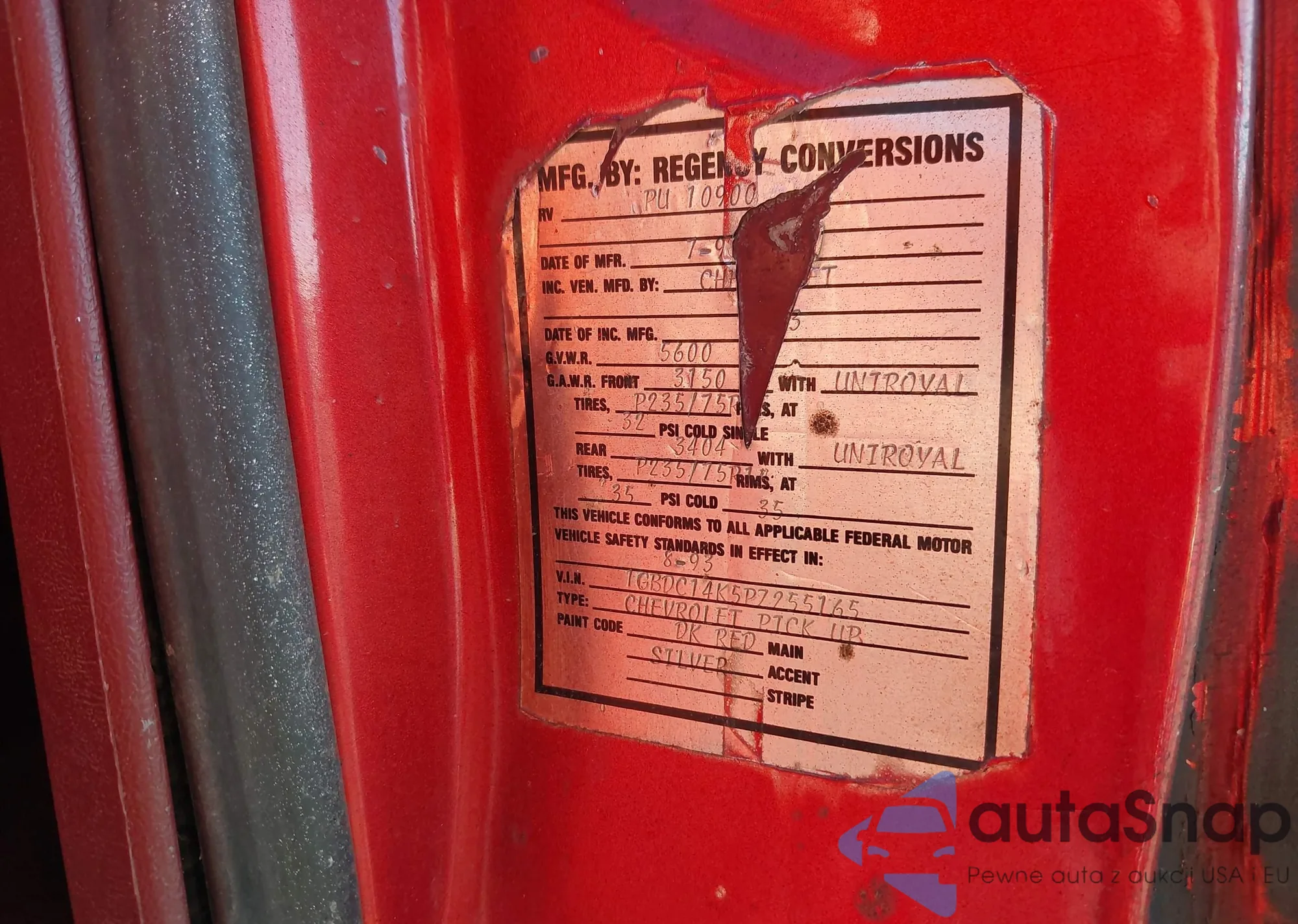 1993 Chevrolet Gmt-400 C1500 z USA, uszkodzony, nr VIN 1GBDC14K5PZ255165