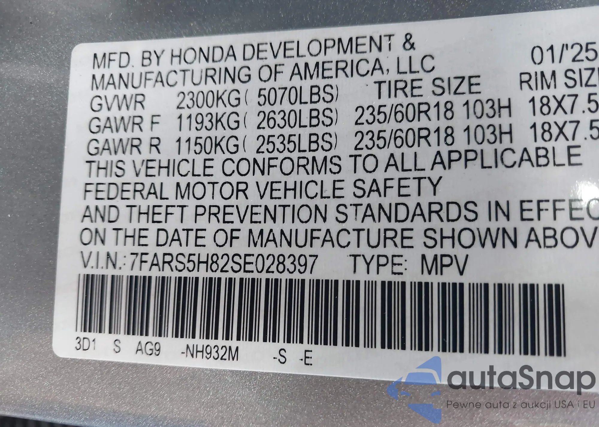 LOT: 44297477 VIN: 7FARS5H82SE028397