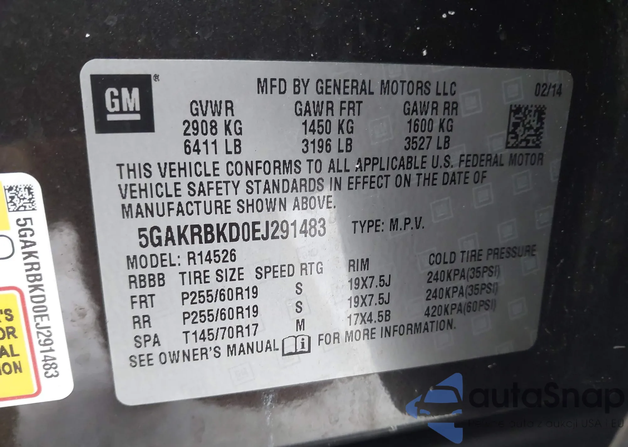 • VIN 5GAKRBKD0EJ291483
