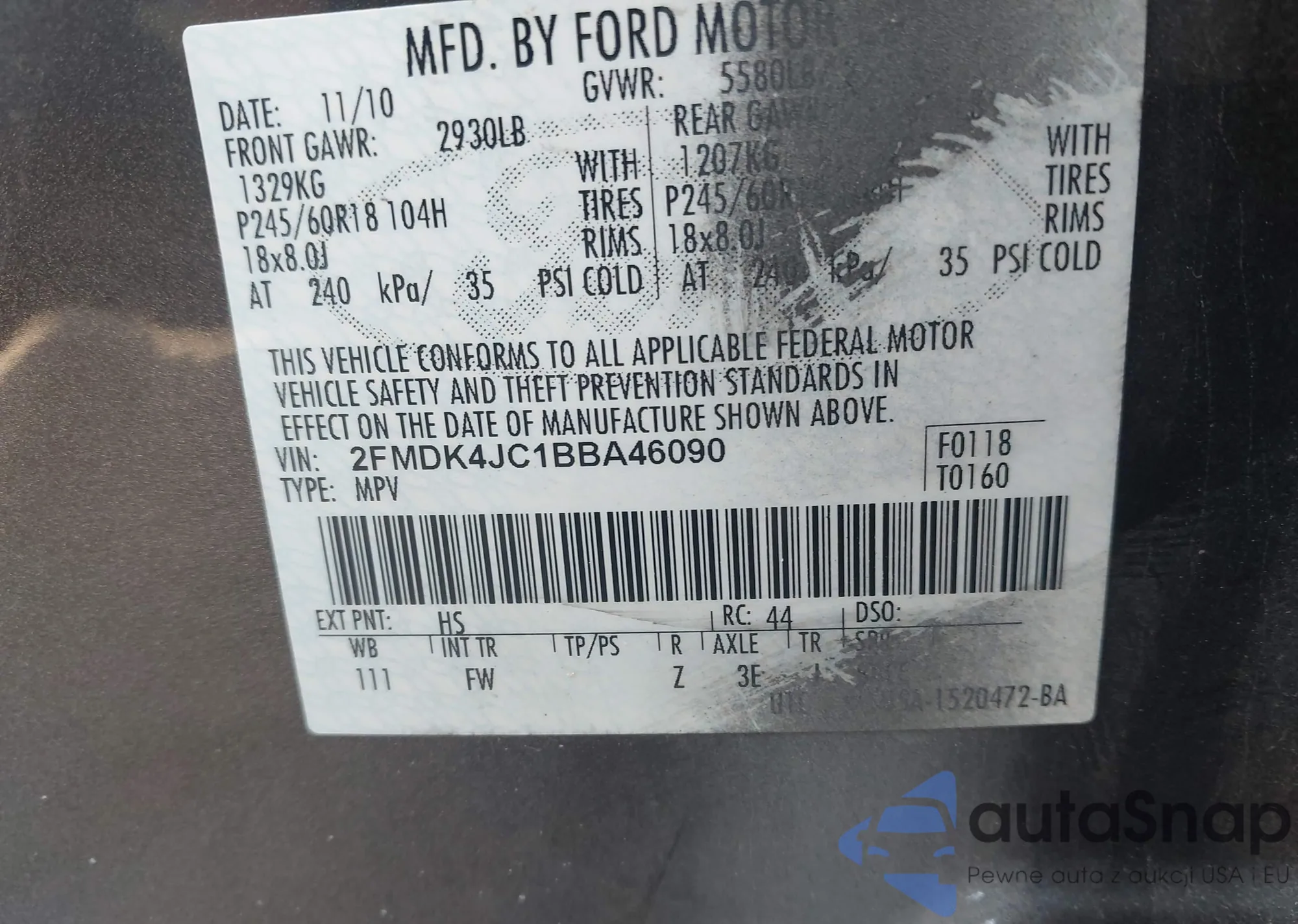 LOT: 44462734 VIN: 2FMDK4JC1BBA46090
