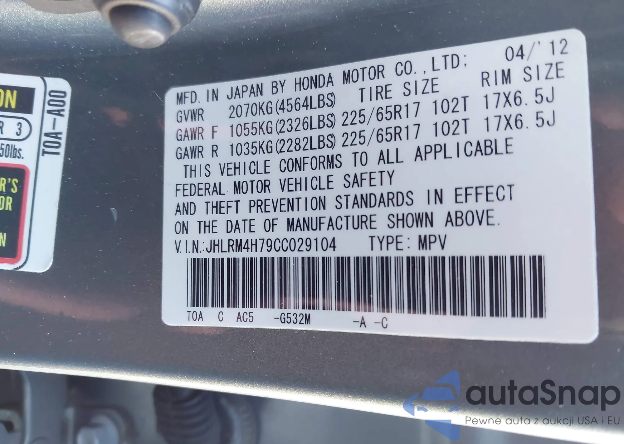 • VIN JHLRM4H79CC029104