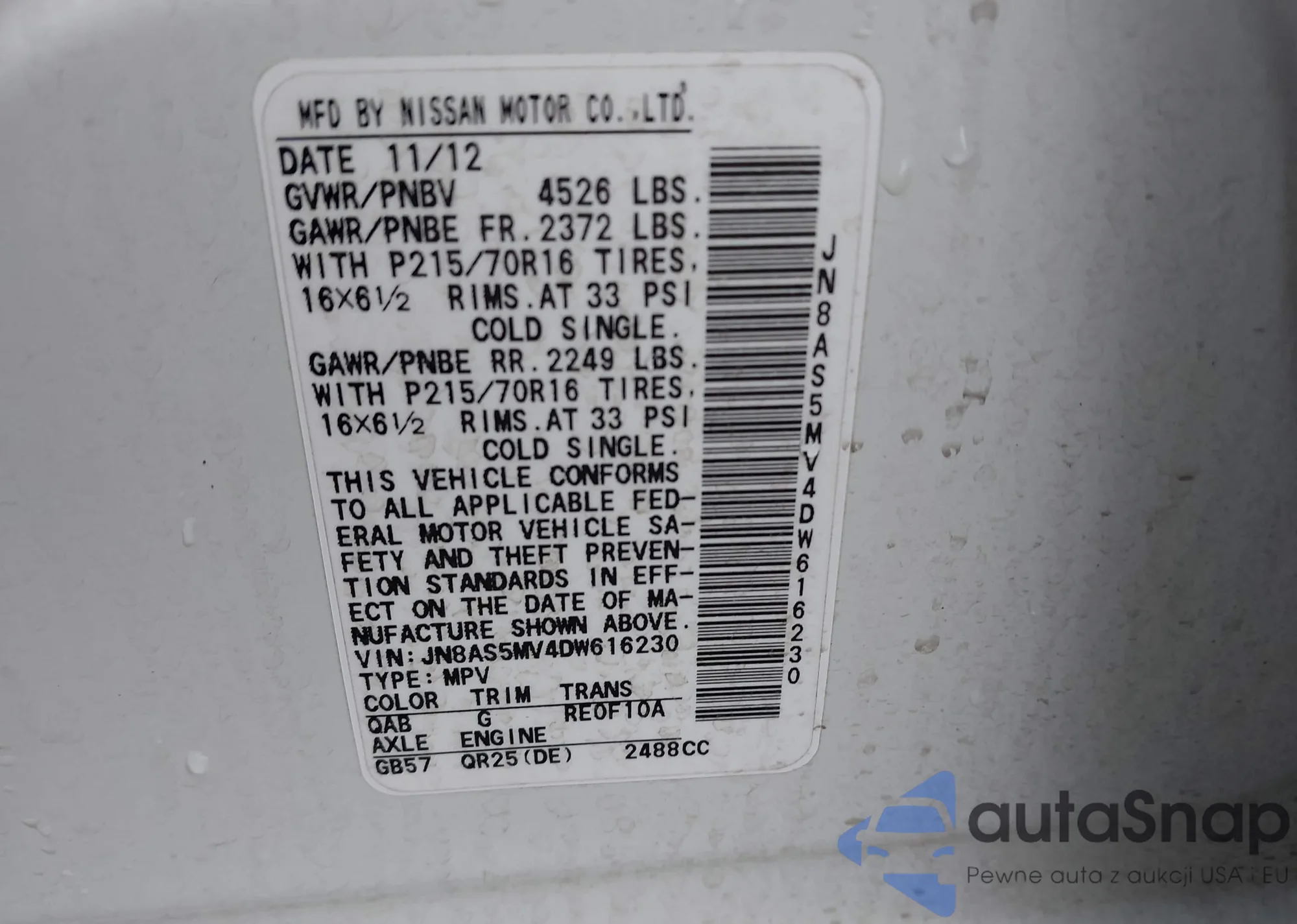 • VIN JN8AS5MV4DW616230