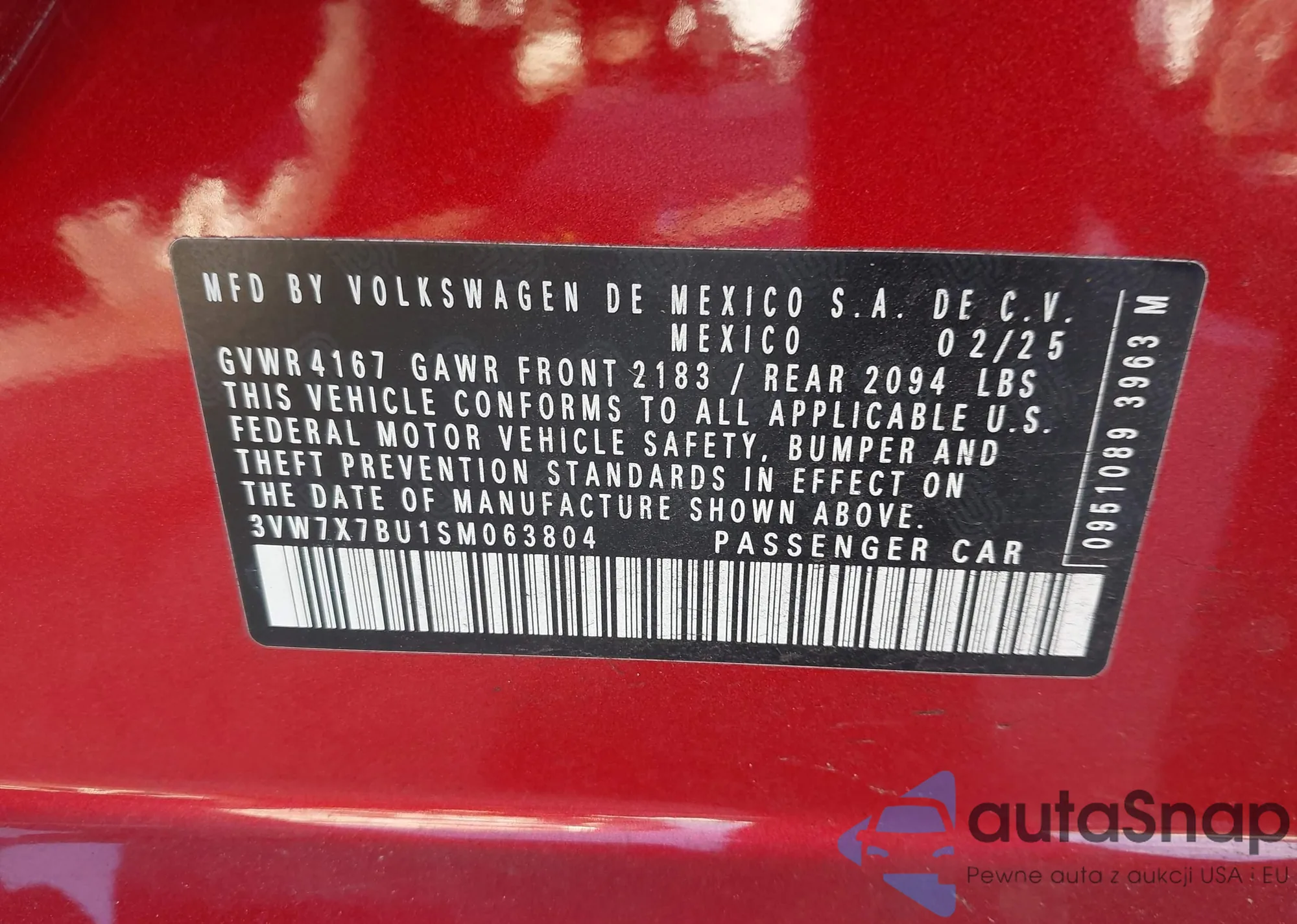 • VIN 3VW7X7BU1SM063804