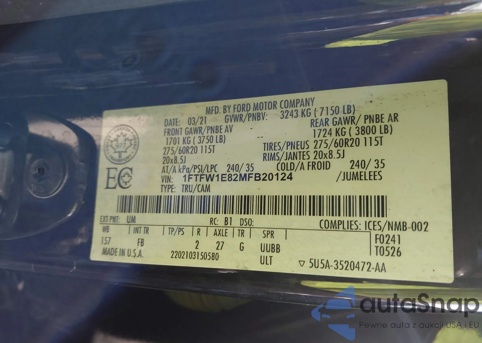 LOT: 44272347 VIN: 1FTFW1E82MFB20124