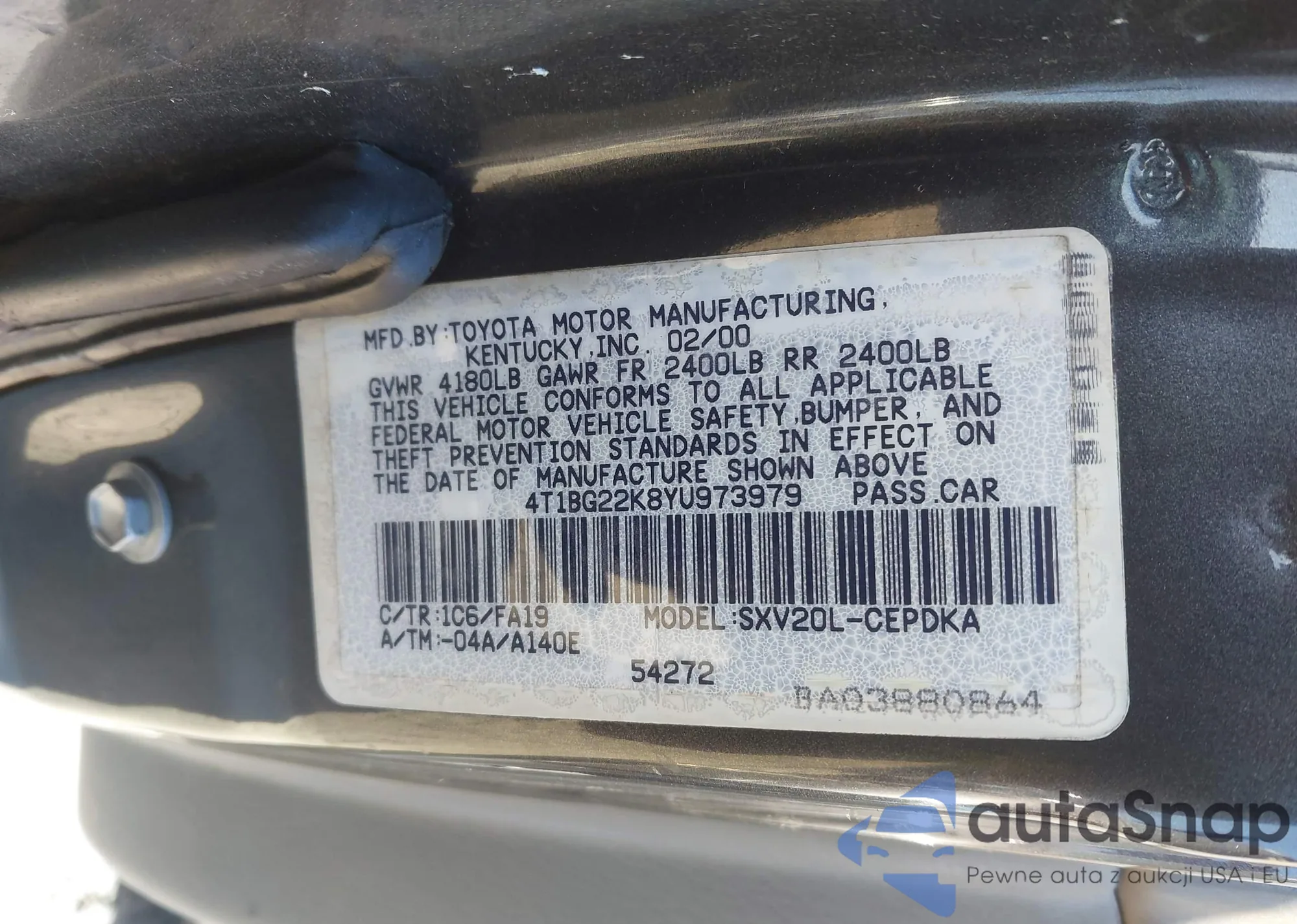 2000 Toyota Camry Ce z USA, uszkodzony, nr VIN 4T1BG22K8YU973979