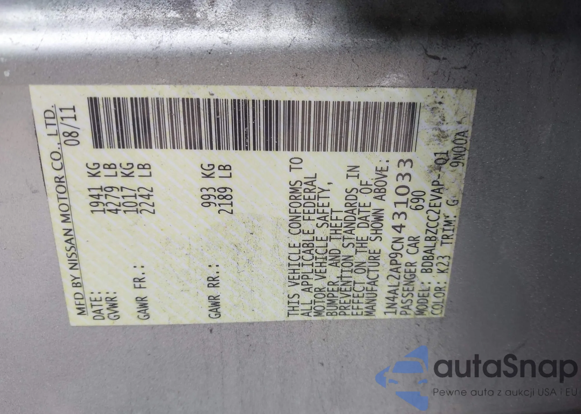 • VIN 1N4AL2AP9CN431033