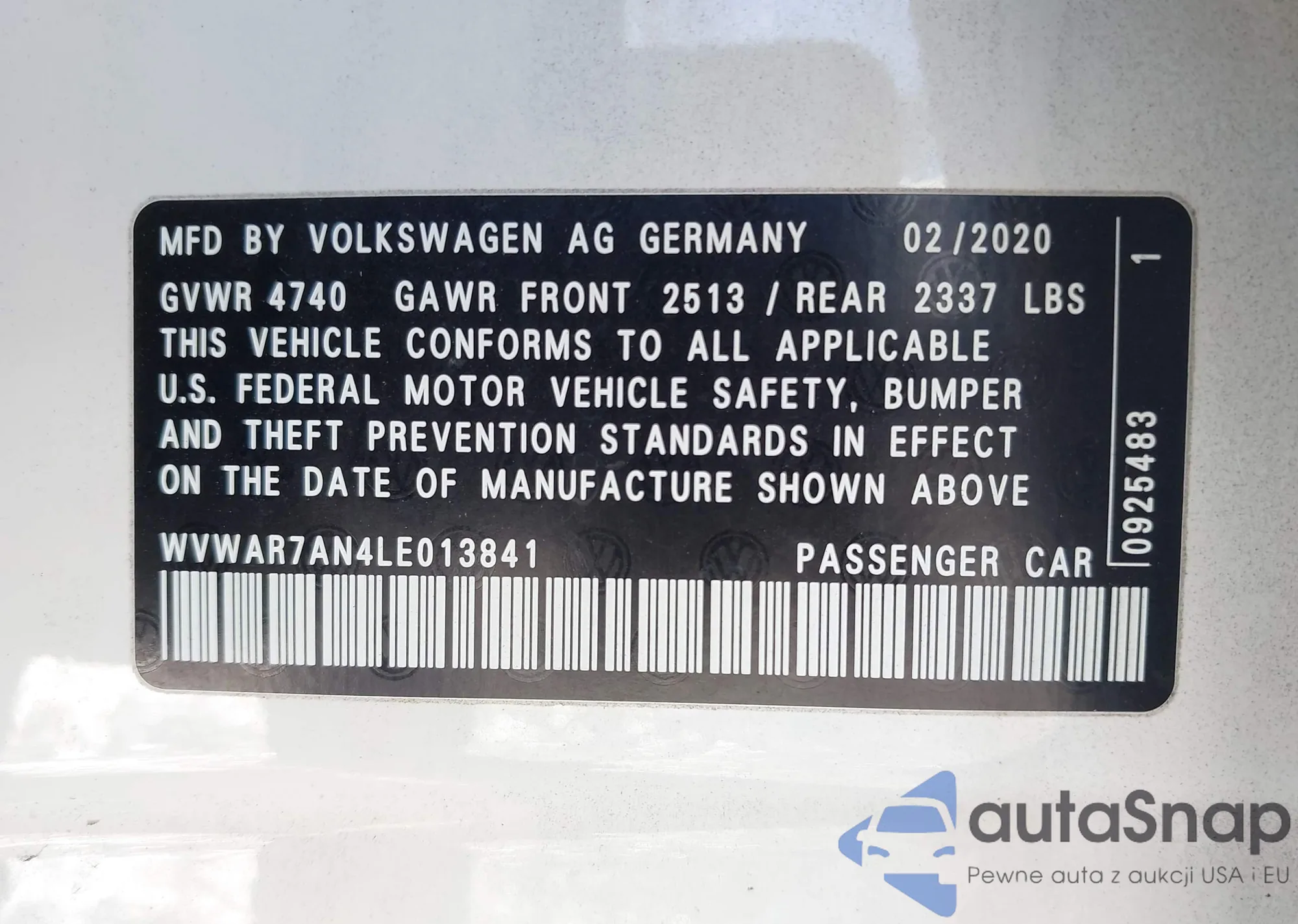 LOT: 44563057 VIN: WVWAR7AN4LE013841