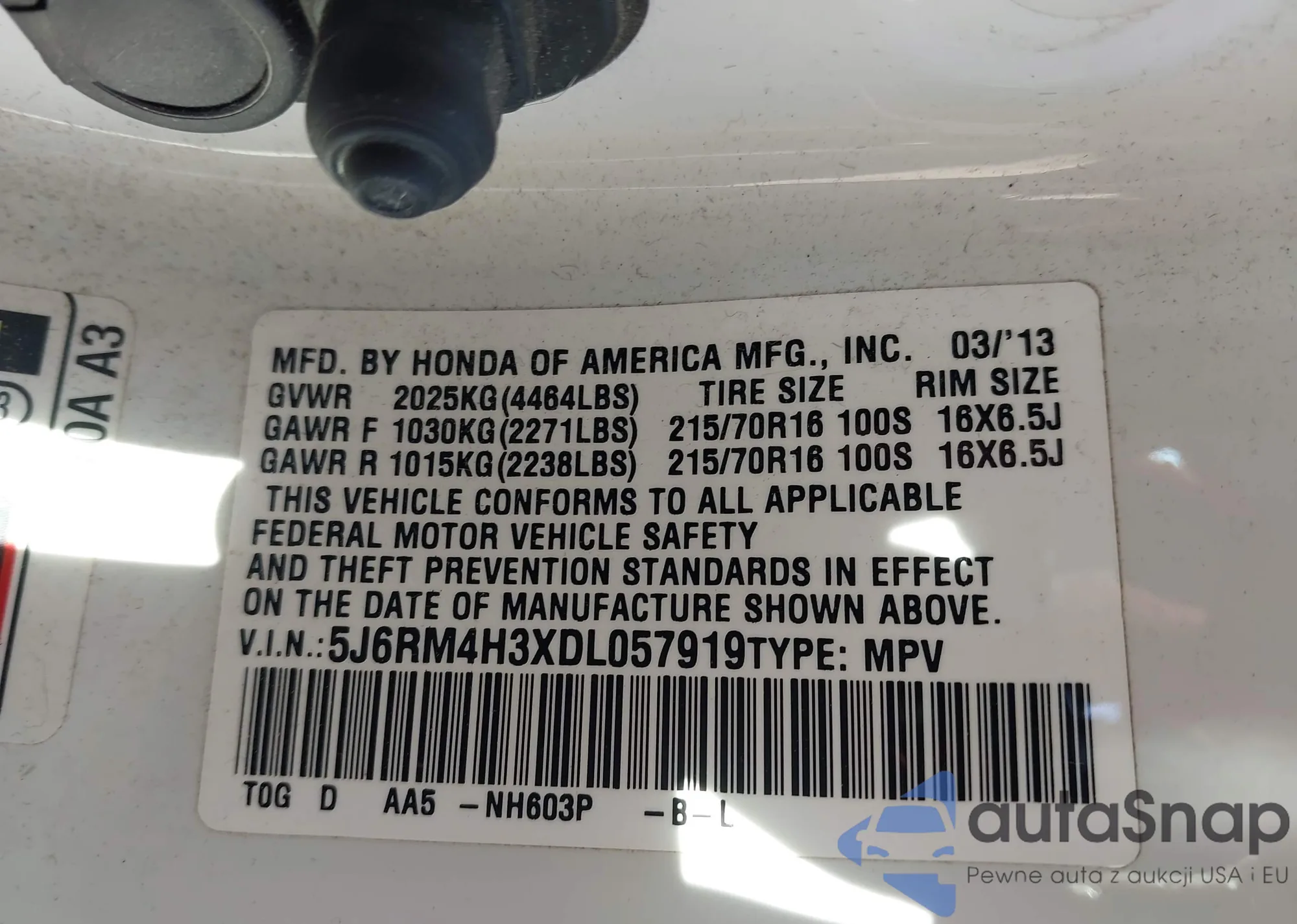 • VIN 5J6RM4H3XDL057919