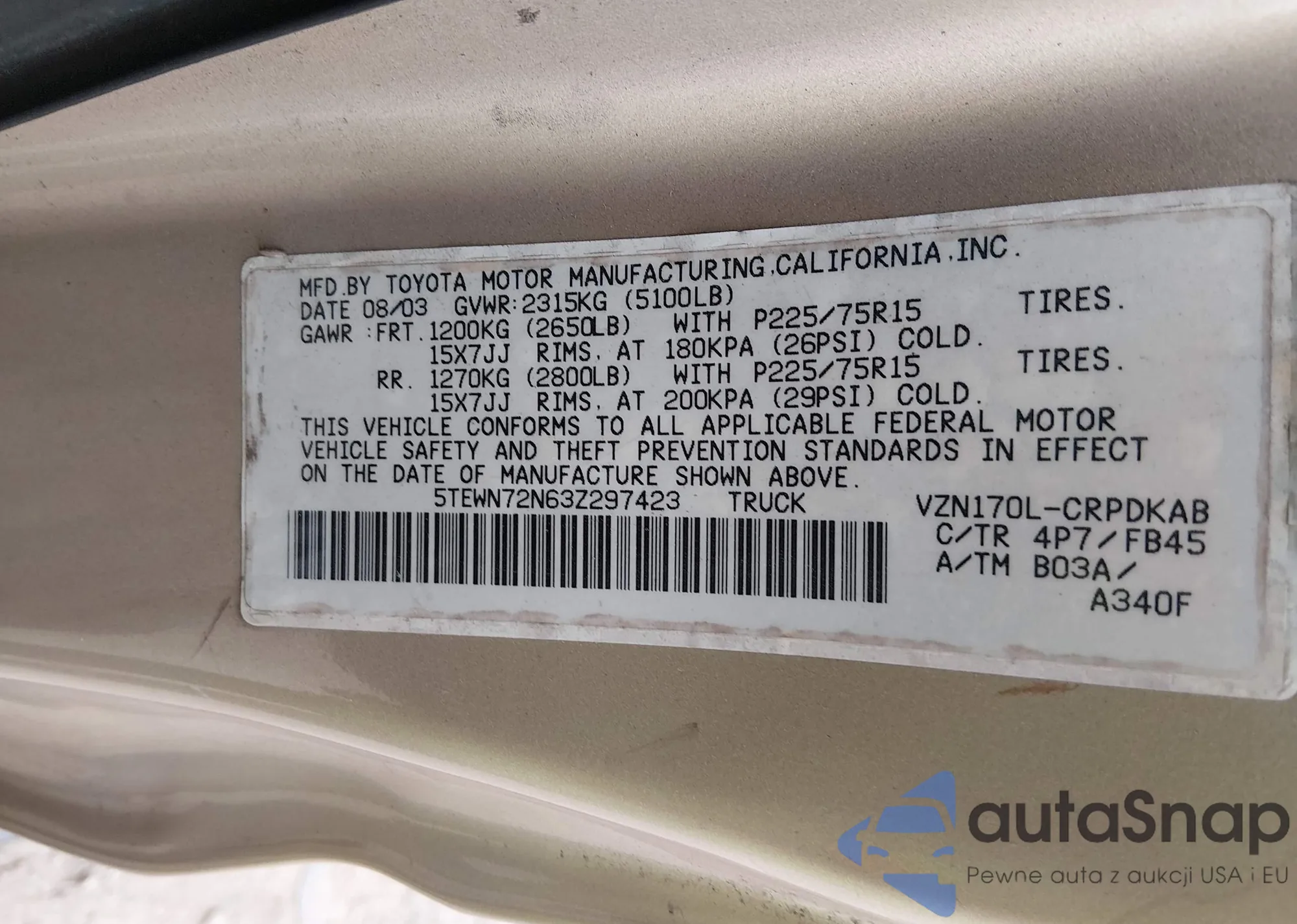 • VIN 5TEWN72N63Z297423