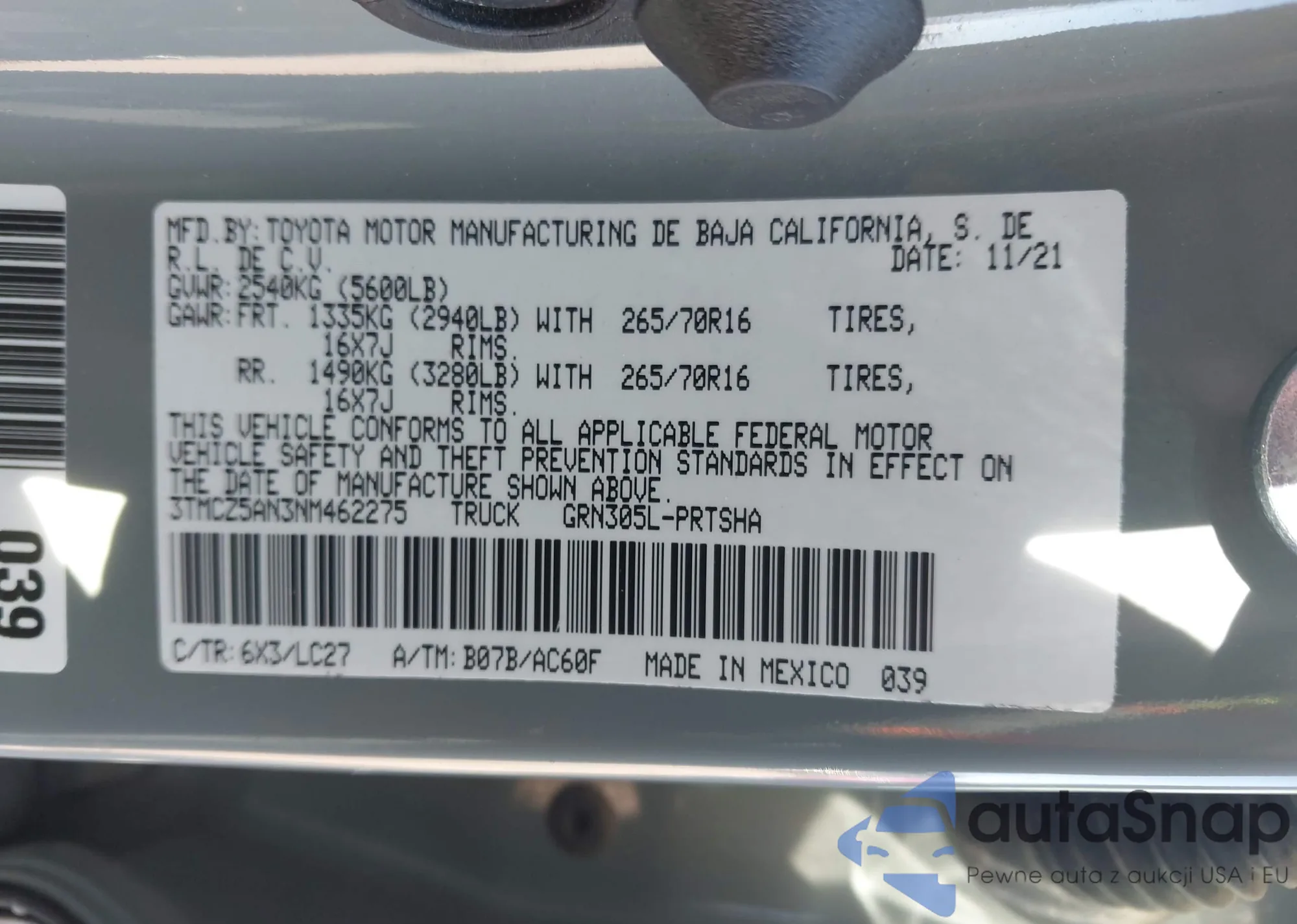 • VIN 3TMCZ5AN3NM462275