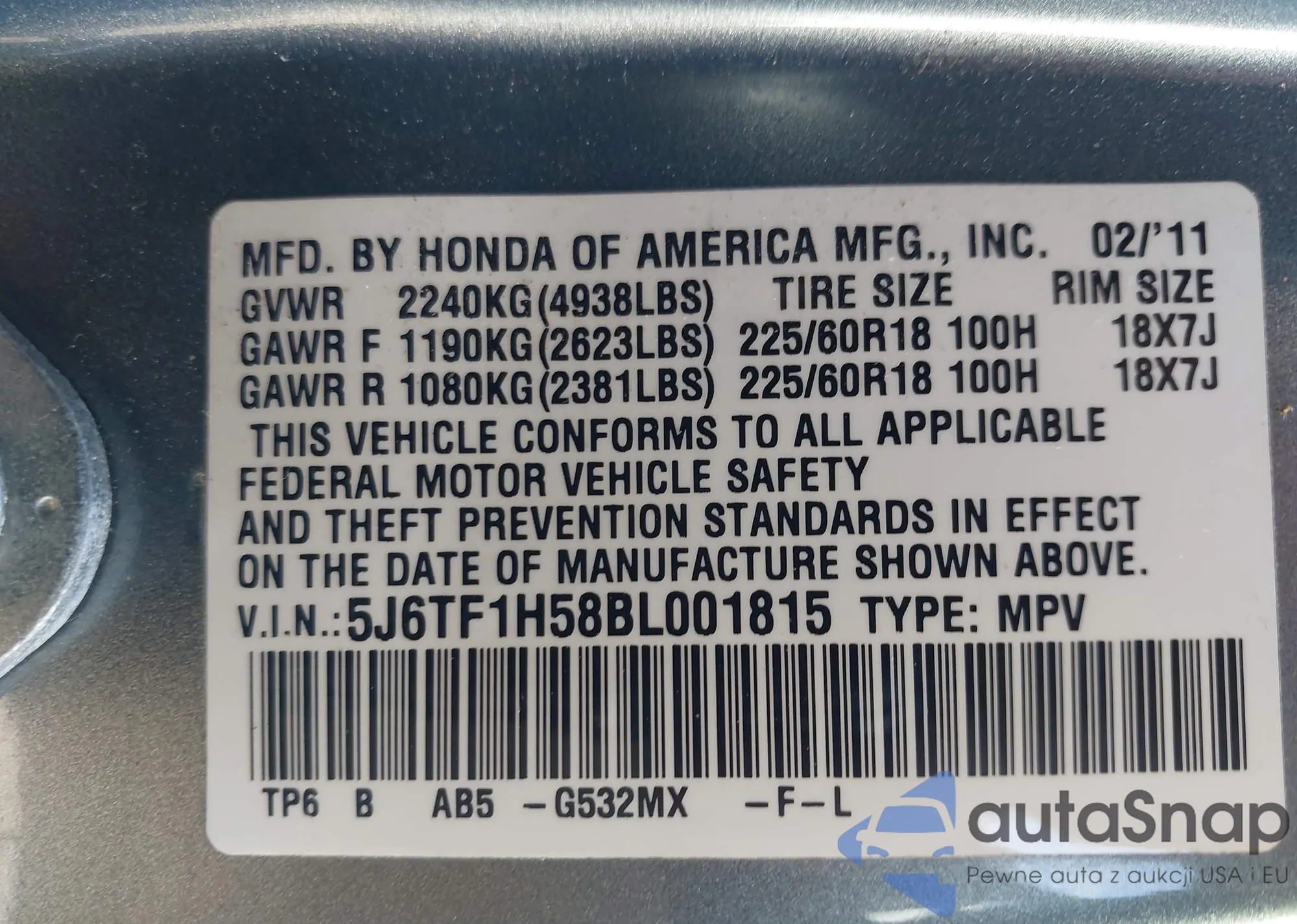 • VIN 2HKRW2H58MH655498