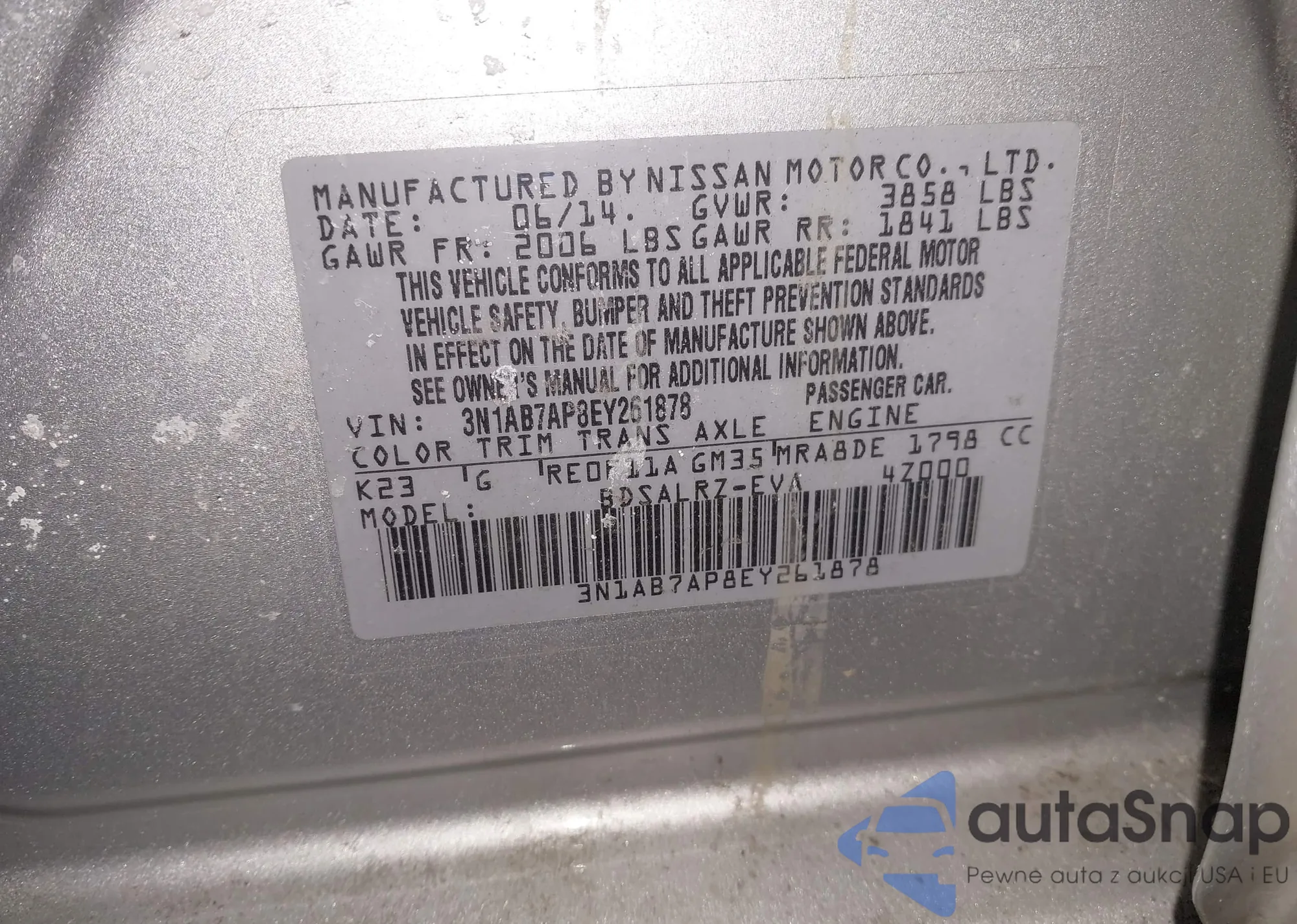 LOT: 44332295 VIN: 3N1AB7AP8EY261878