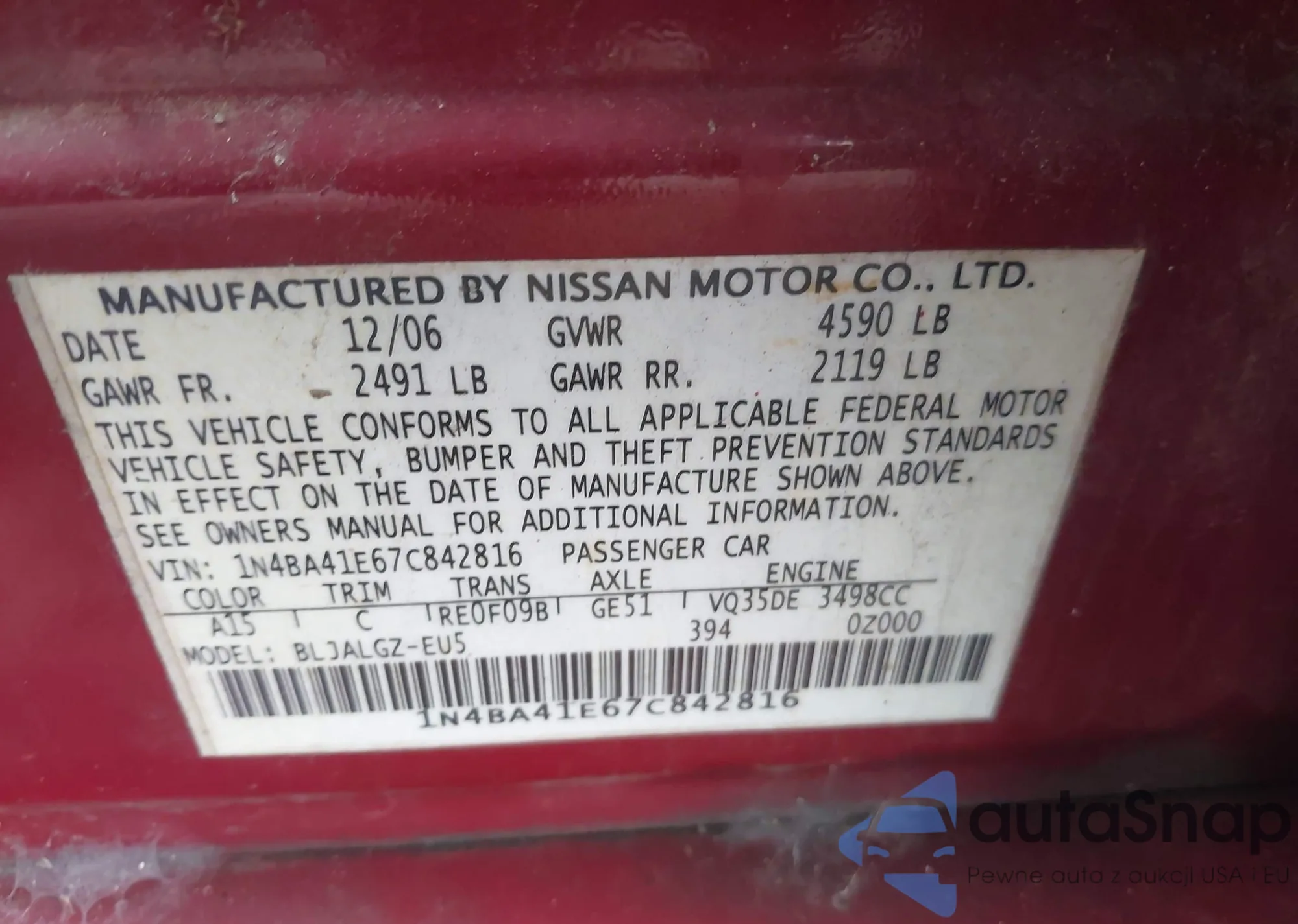 LOT: 44369761 VIN: 1N4BA41E67C842816