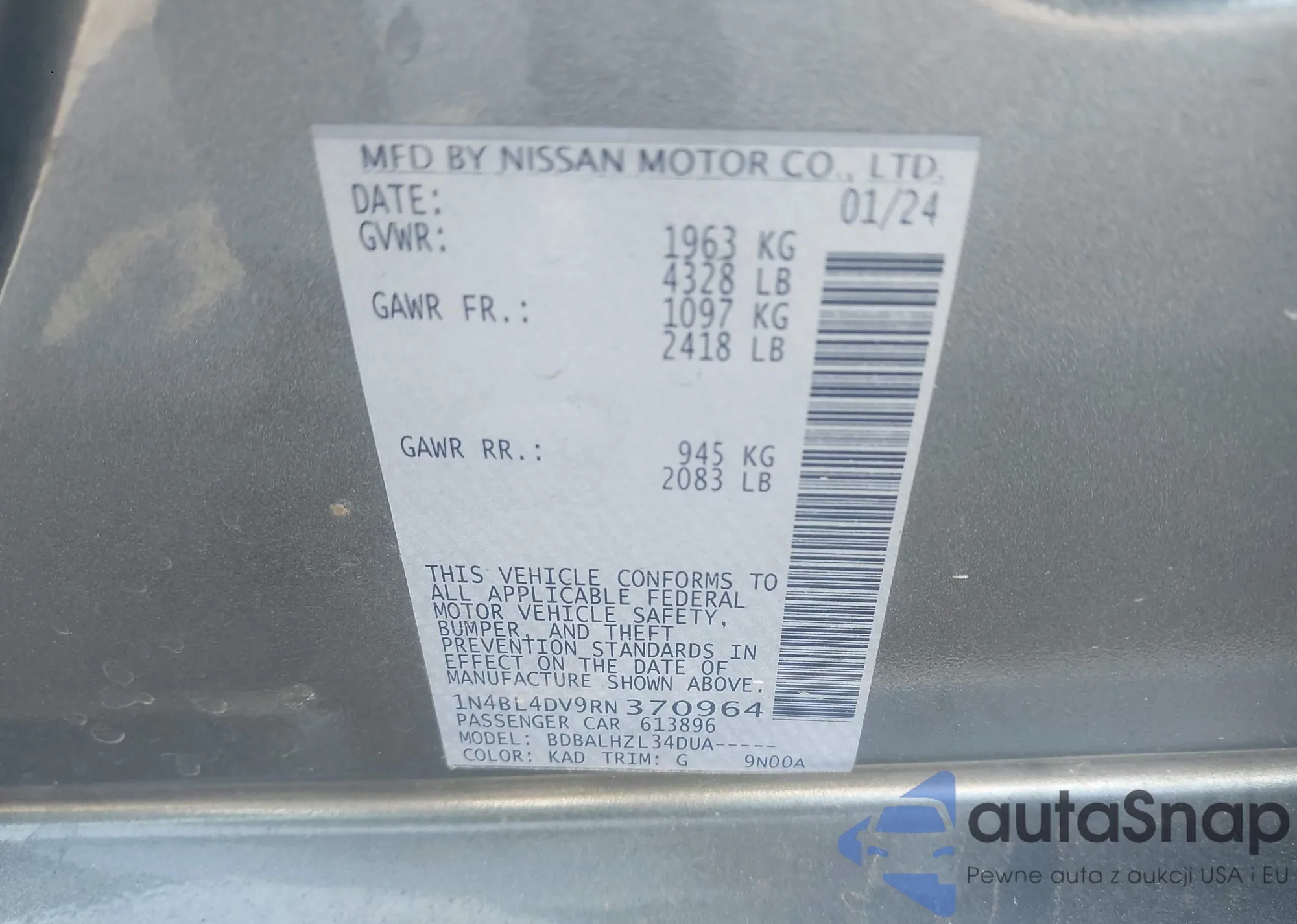 • VIN 1N4BL4DV9RN370964