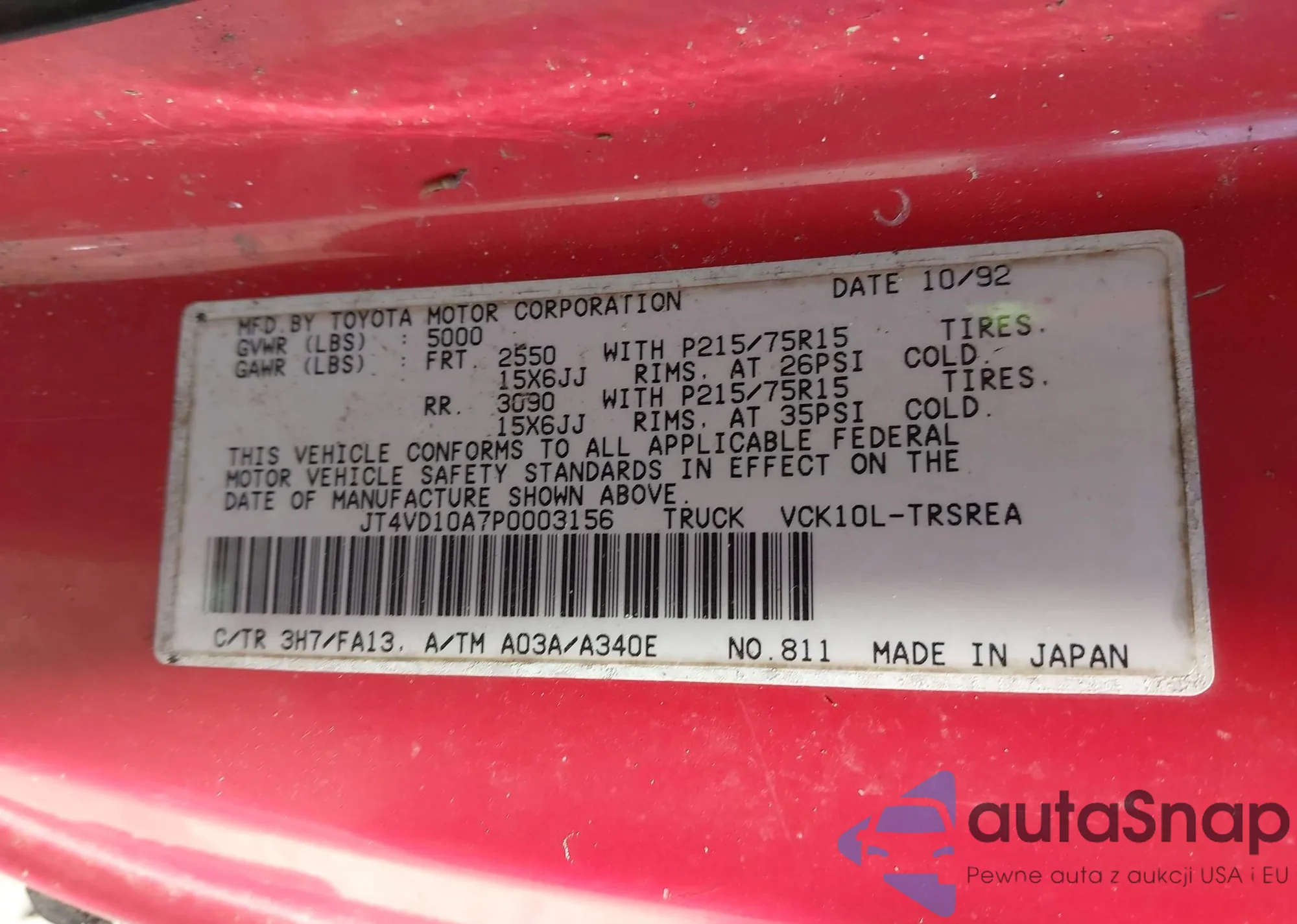 Samochód Toyota T100 1993 (VIN JT4VD10A7P0003156) nie był wcześniej licytowany. Dokumenty są czyste, przebieg odpowiada lub jest niższy niż średnia rynku. Sprzedaje go firma ubezpieczeniowa – polecamy zakup. Dostawa do portu zajmie ok. 6–8 tygodni.