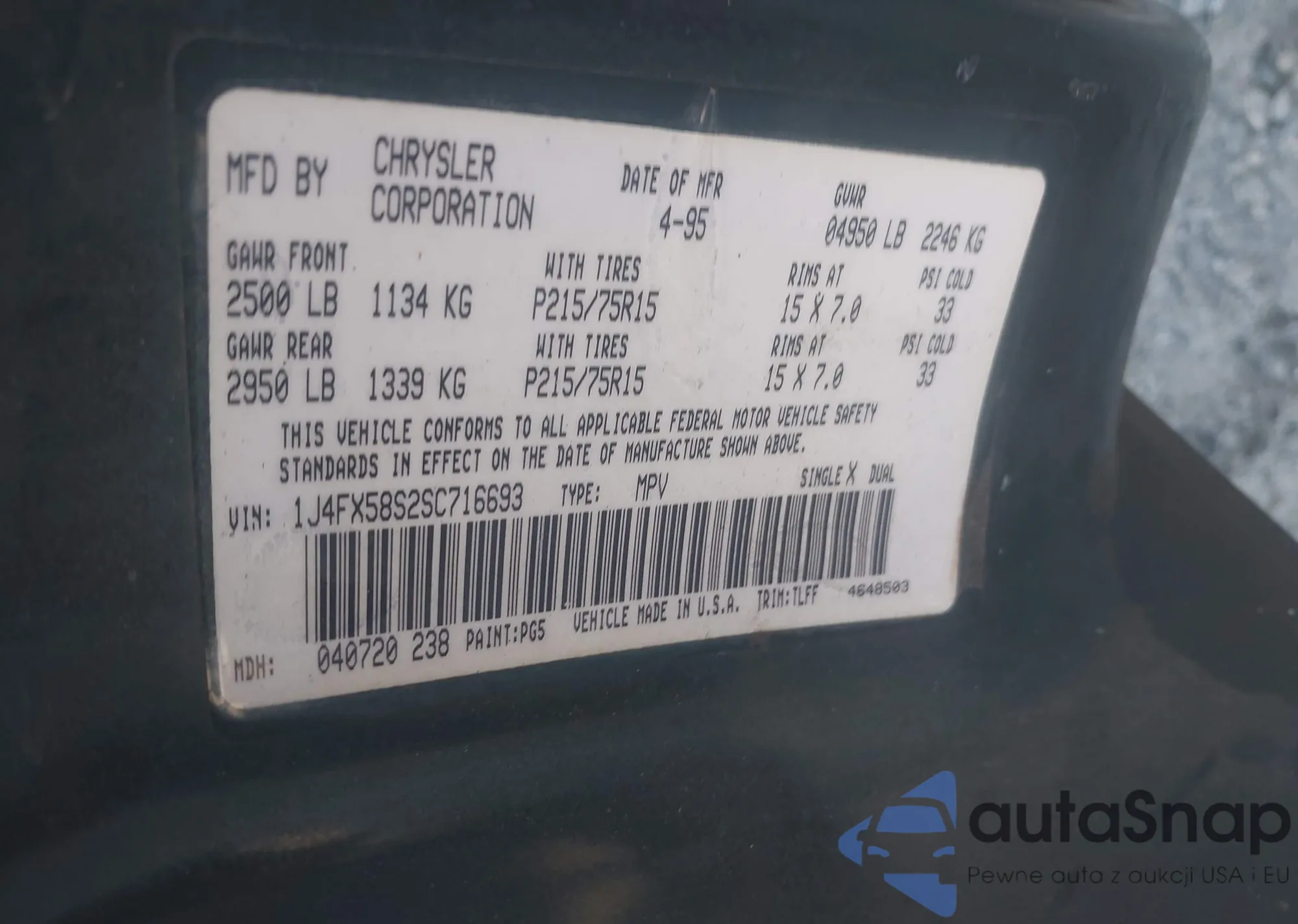 Samochód Jeep Grand Cherokee 1995 (VIN 1J4FX58S2SC716693) ma dokumenty uniemożliwiające rejestrację. Mogą pojawić się trudności przy eksporcie i rejestracji. Skontaktuj się z ekspertami AutaSnap w celu znalezienia alternatywy.