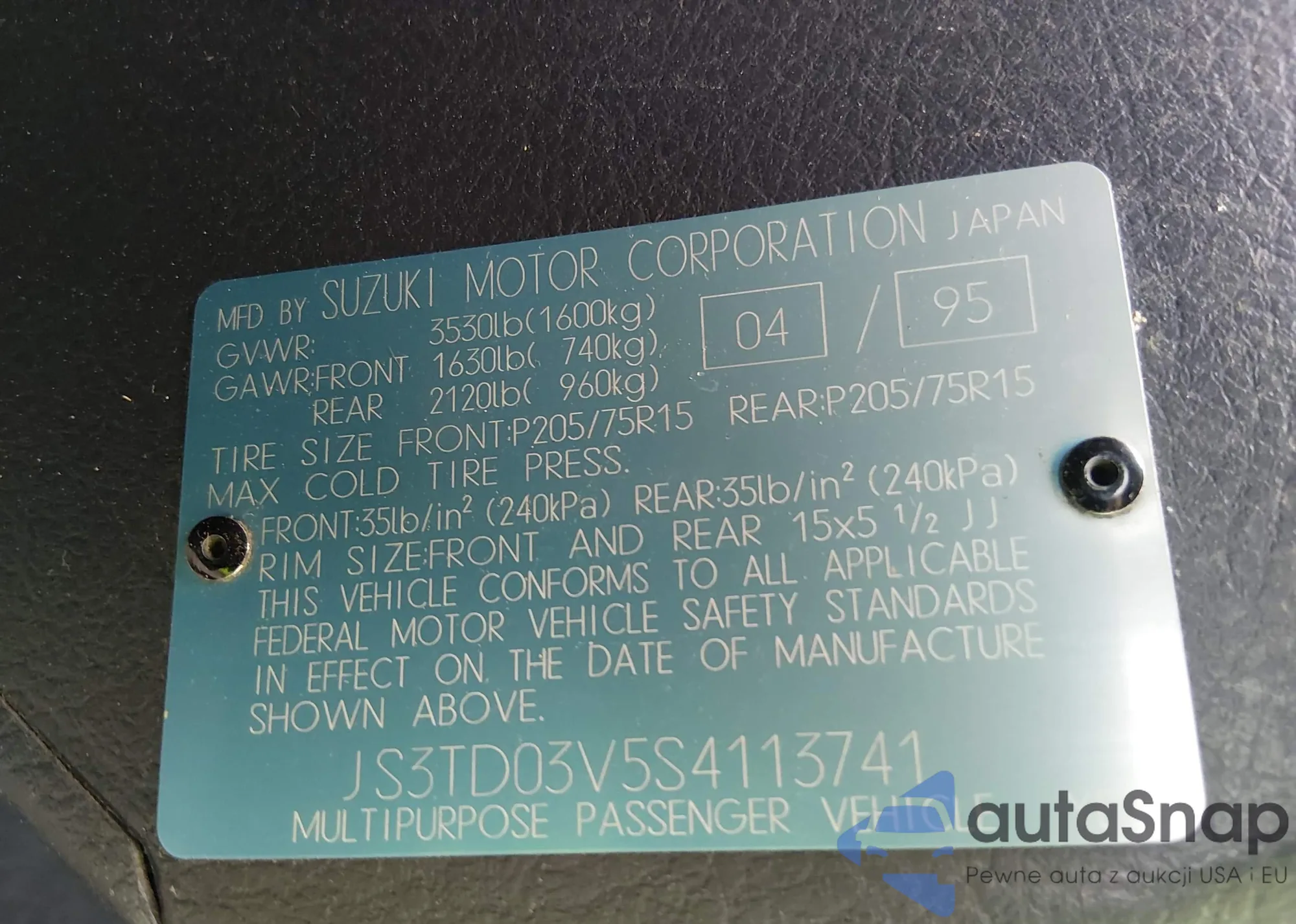 Samochód Suzuki Sidekick 1995 (VIN JS3TD03V5S4113741) sprzedaje go niezweryfikowany sprzedawca. Zalecamy raport Carfax i potwierdzenie możliwości rejestracji pojazdu przed zakupem.