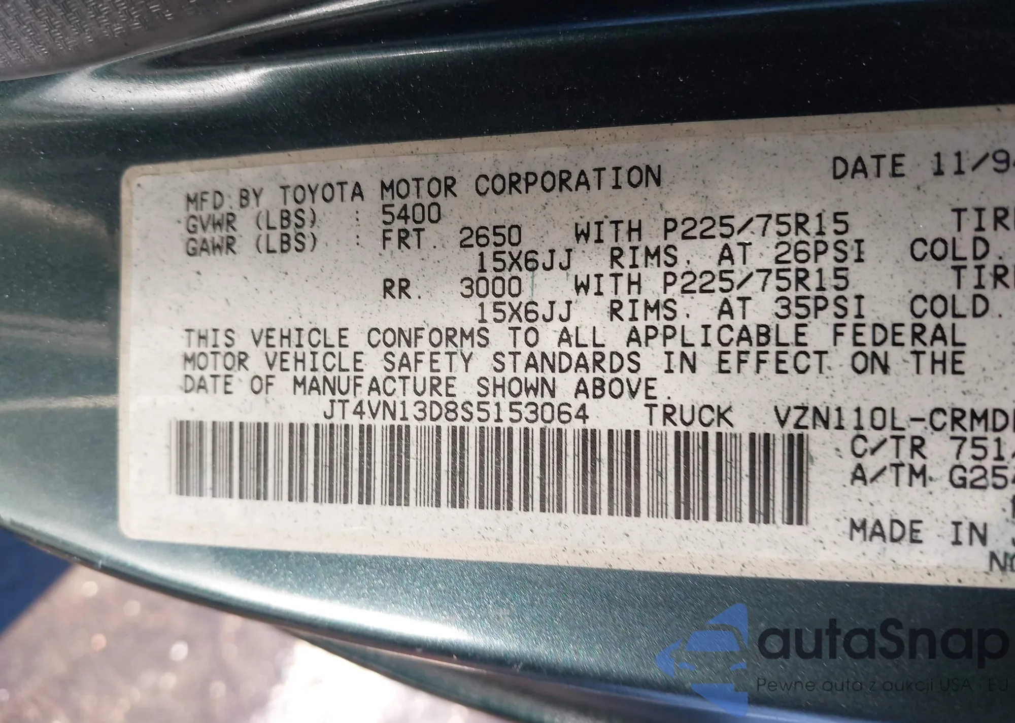 Samochód Toyota Pickup 1995 (VIN JT4VN13D8S5153064) nie był wcześniej licytowany. Dokumenty są czyste, przebieg odpowiada lub jest niższy niż średnia rynku. Sprzedaje go firma ubezpieczeniowa – polecamy zakup. Dostawa do portu zajmie ok. 6–8 tygodni.