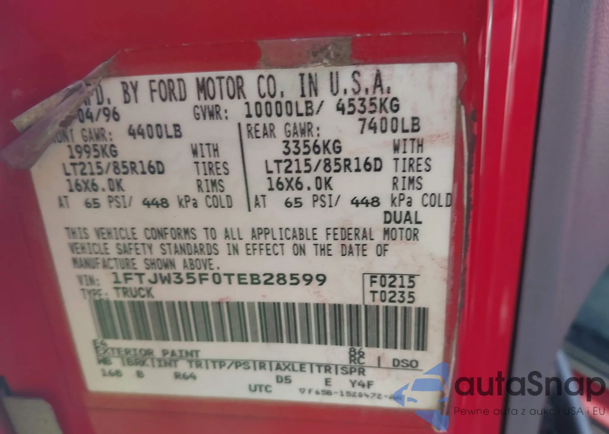 • VIN: 1FTJW35F0TEB28599