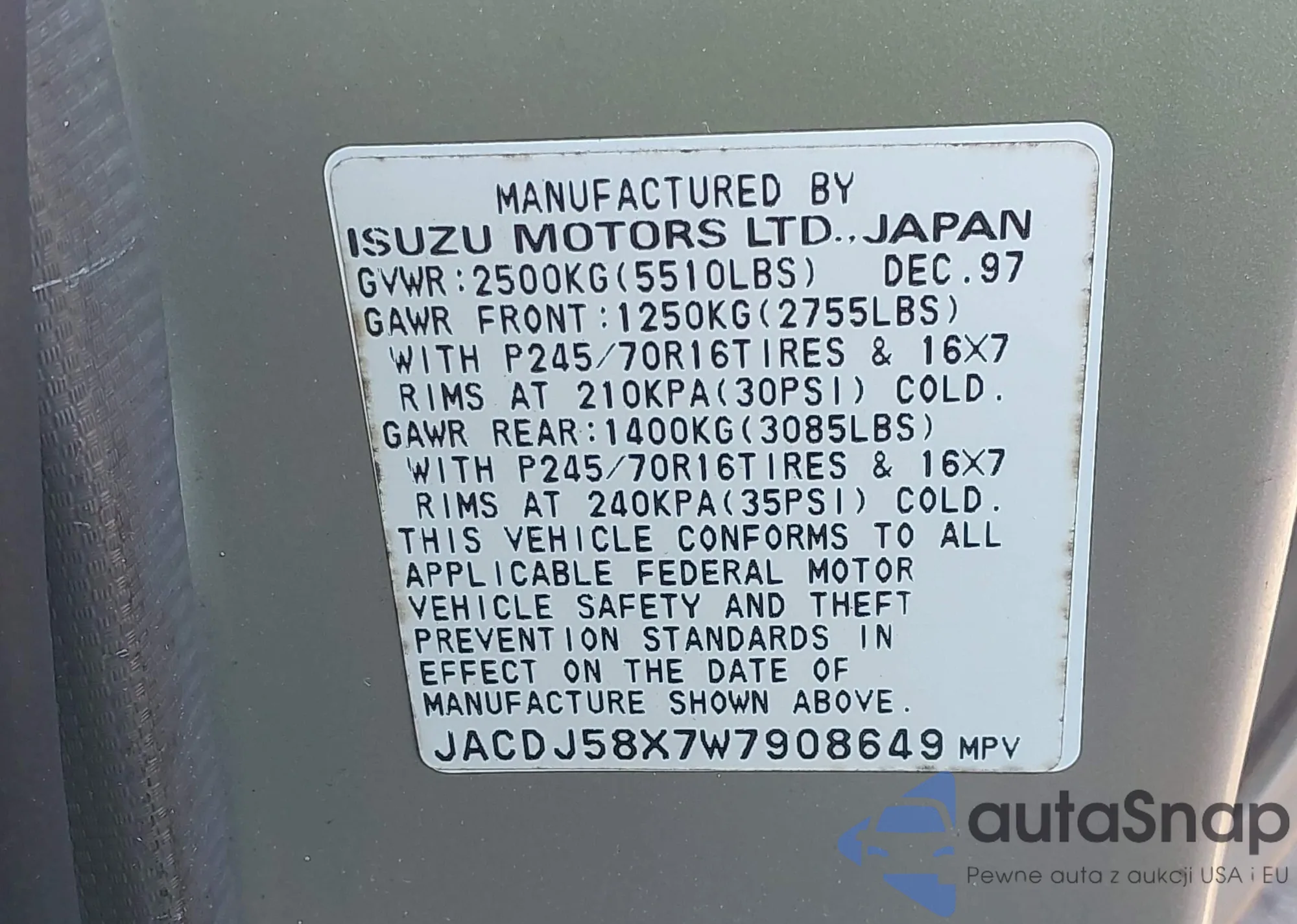 Samochód Isuzu Trooper 1998 (VIN JACDJ58X7W7908649) nie był wcześniej licytowany. Dokumenty są czyste, przebieg odpowiada lub jest niższy niż średnia rynku. Sprzedaje go firma ubezpieczeniowa – polecamy zakup. Dostawa do portu zajmie ok. 6–8 tygodni.