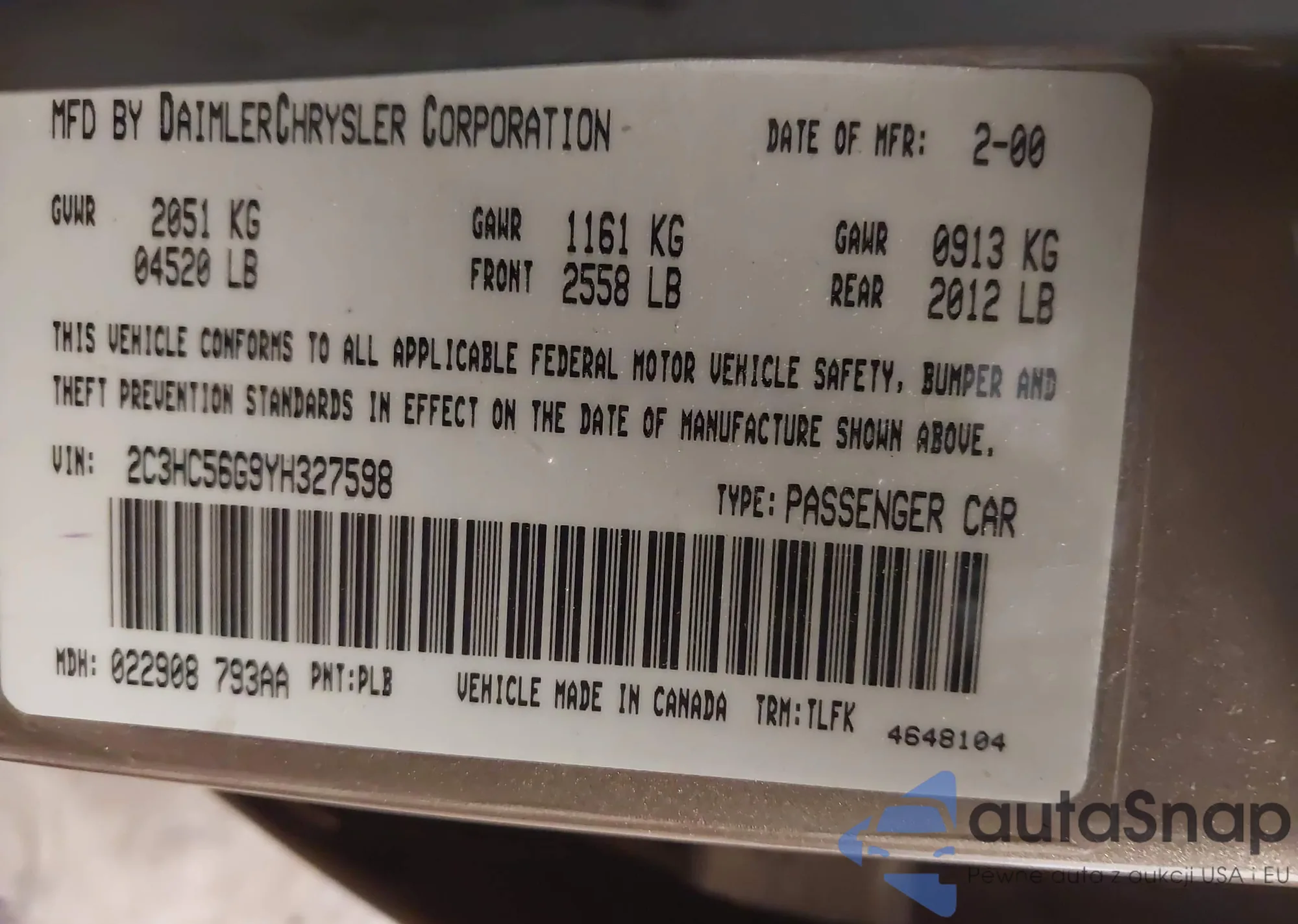 VIN: 2C3HC56G9YH327598