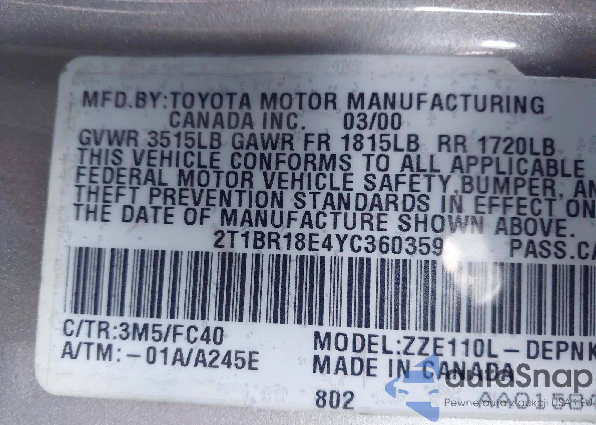 Samochód Toyota Corolla 2000 (VIN 2T1BR18E4YC360359) nie był wcześniej licytowany. Dokumenty są czyste, przebieg odpowiada lub jest niższy niż średnia rynku. Sprzedaje go firma ubezpieczeniowa – polecamy zakup. Dostawa do portu zajmie ok. 6–8 tygodni.