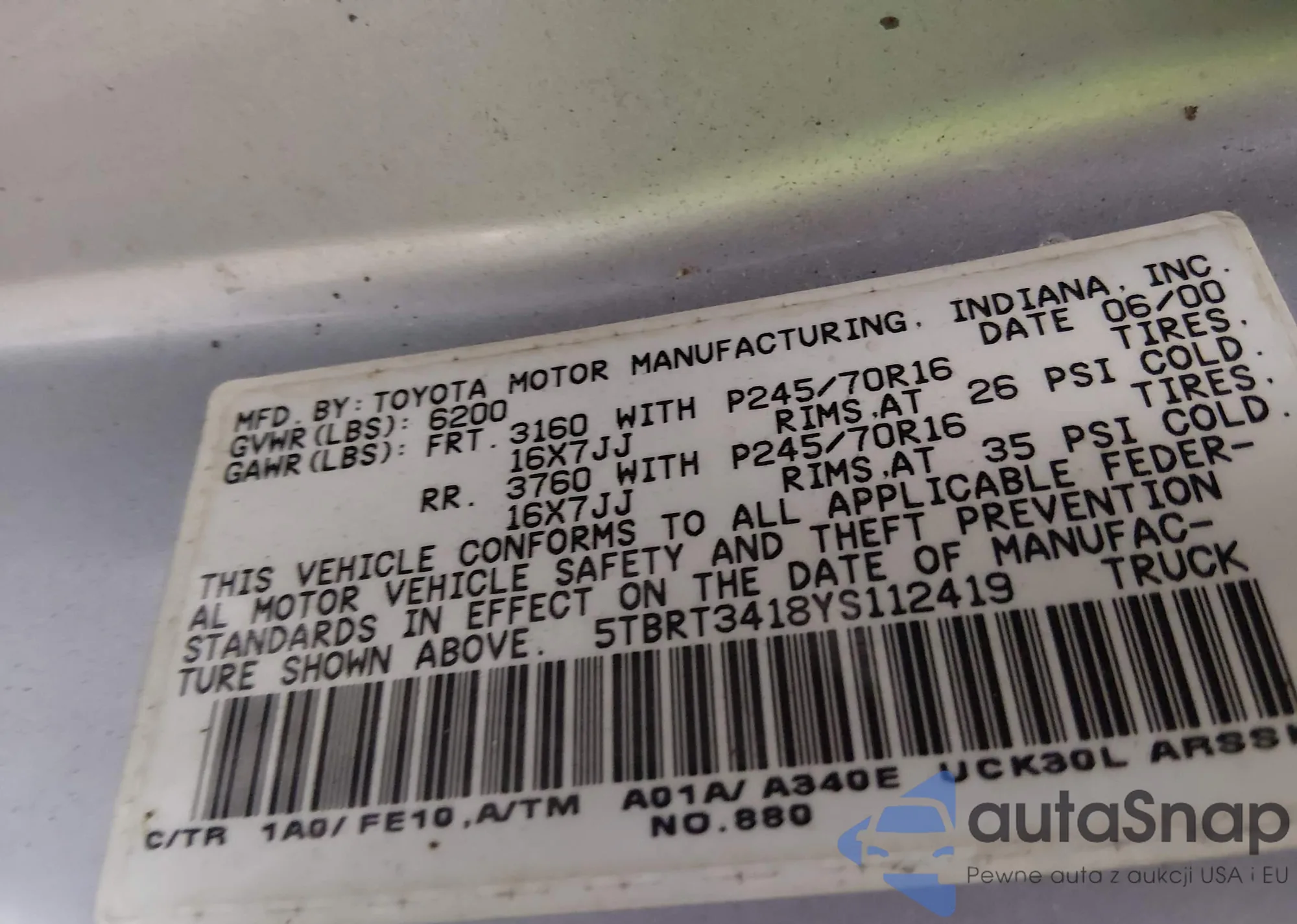 Samochód Toyota Tundra 2000 (VIN 5TBRT3418YS112419) nie był wcześniej licytowany. Dokumenty są czyste, przebieg odpowiada lub jest niższy niż średnia rynku. Sprzedaje go firma ubezpieczeniowa – polecamy zakup. Dostawa do portu zajmie ok. 6–8 tygodni.