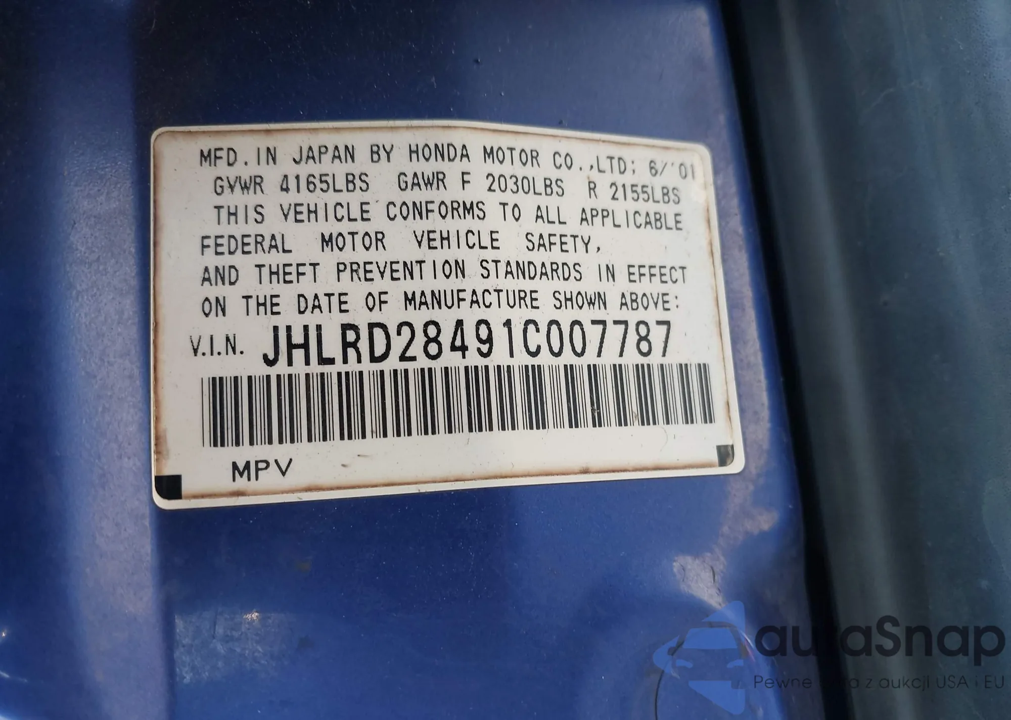 Samochód Honda CR-V 2001 (VIN JHLRD28491C007787) nie był wcześniej licytowany. Dokumenty są czyste, przebieg odpowiada lub jest niższy niż średnia rynku. Sprzedaje go firma ubezpieczeniowa – polecamy zakup. Dostawa do portu zajmie ok. 6–8 tygodni.
