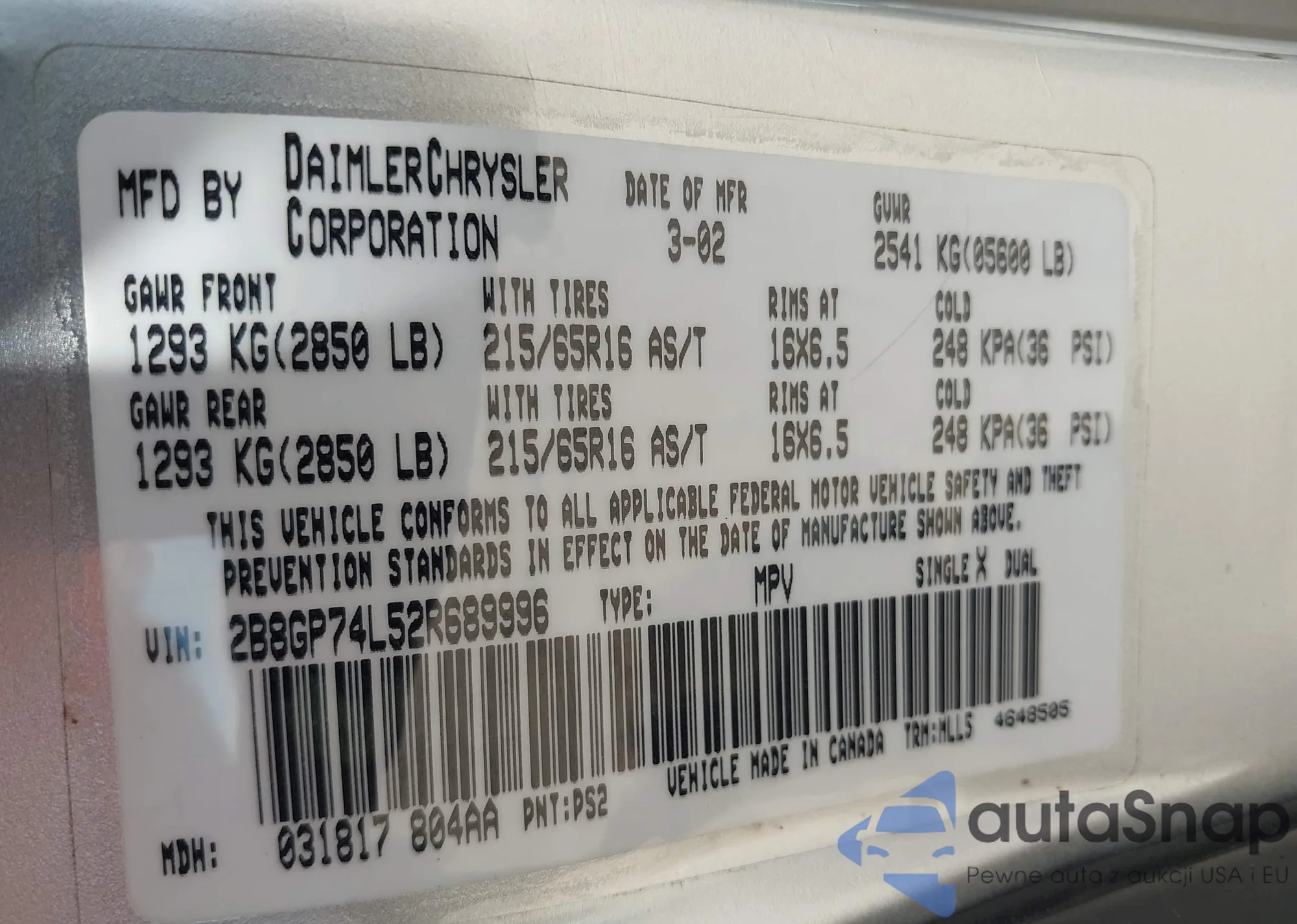 • VIN: 2B8GP74L52R689996