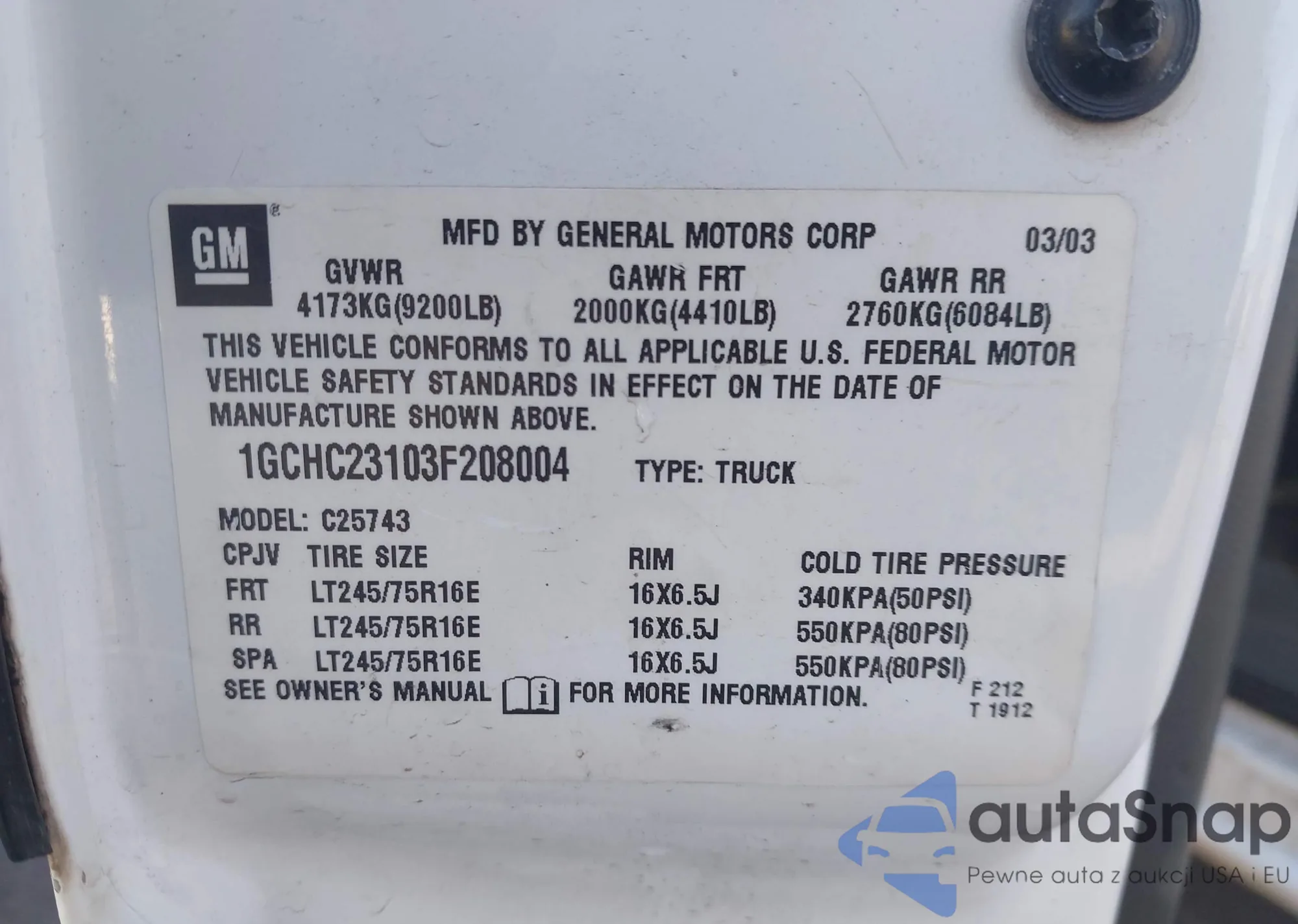 • VIN: 1GCHC23103F208004