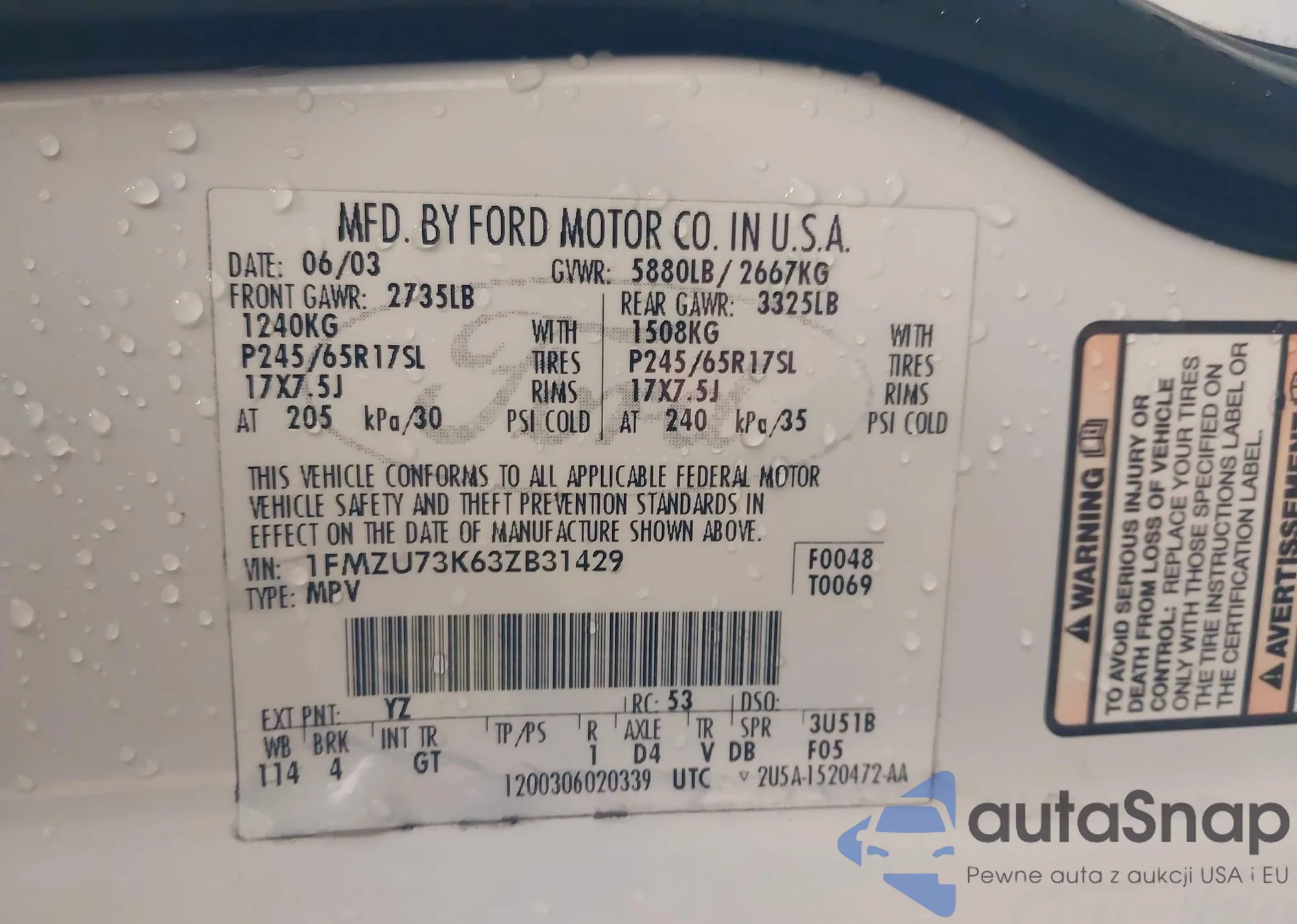 Samochód Ford Explorer 2003 (VIN 1FMZU73K63ZB31429) nie był wcześniej licytowany. Dokumenty są czyste, przebieg odpowiada lub jest niższy niż średnia rynku. Sprzedaje go firma ubezpieczeniowa – polecamy zakup. Dostawa do portu zajmie ok. 6–8 tygodni.