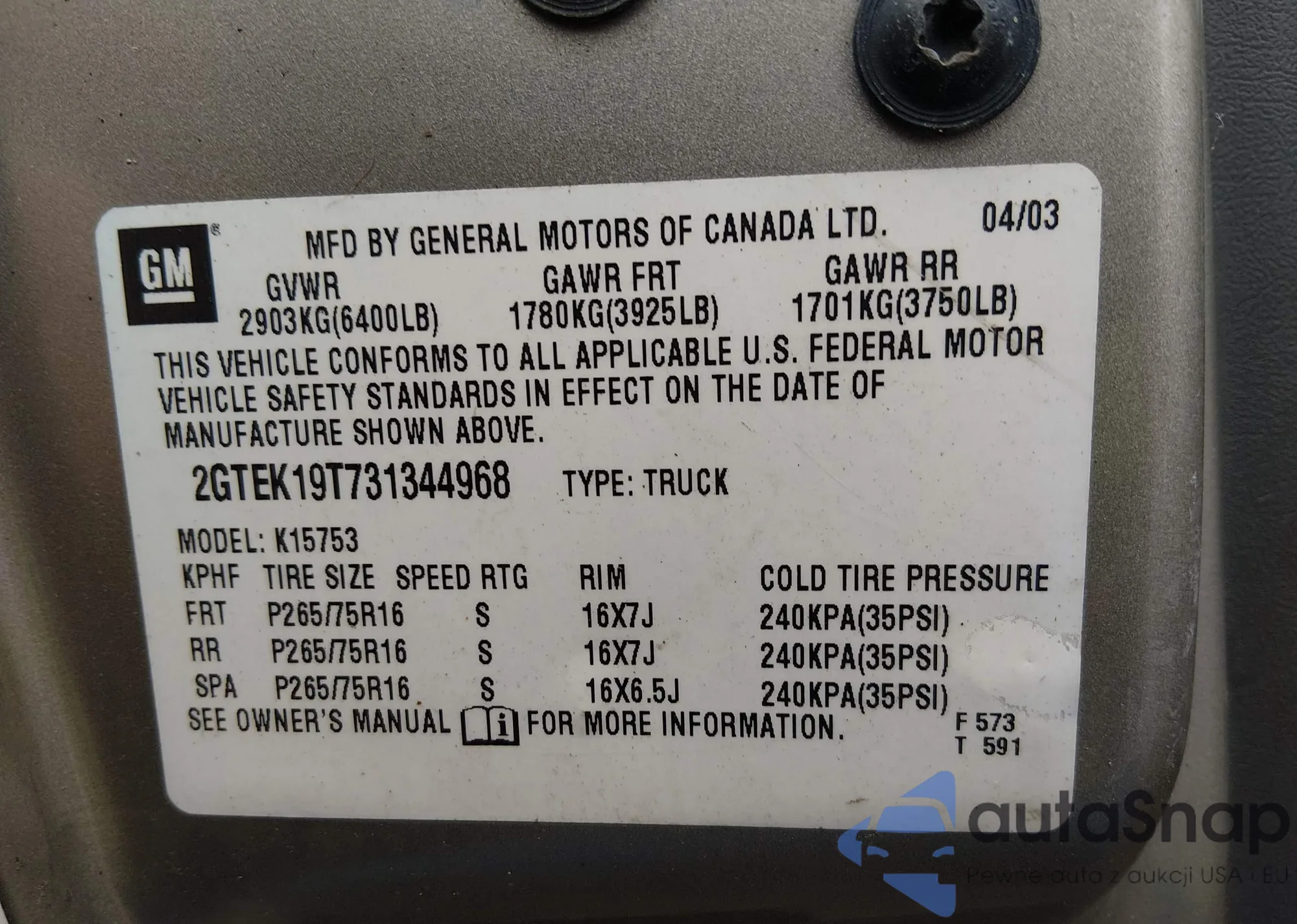 • VIN: 2GTEK19T731344968