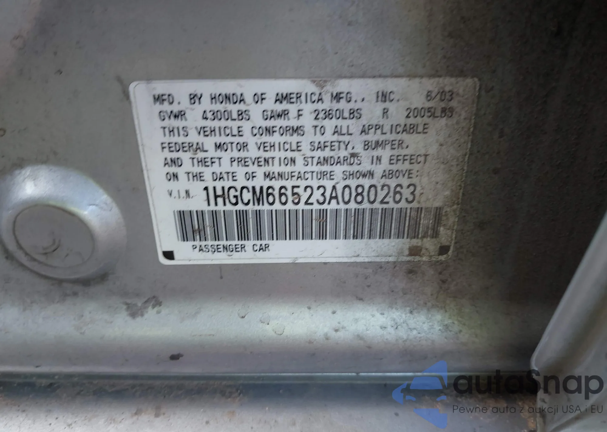 Samochód Honda Accord 2003 (VIN 1HGCM66523A080263) nie był wcześniej licytowany. Dokumenty są czyste, przebieg odpowiada lub jest niższy niż średnia rynku. Sprzedaje go firma ubezpieczeniowa – polecamy zakup. Dostawa do portu zajmie ok. 6–8 tygodni.
