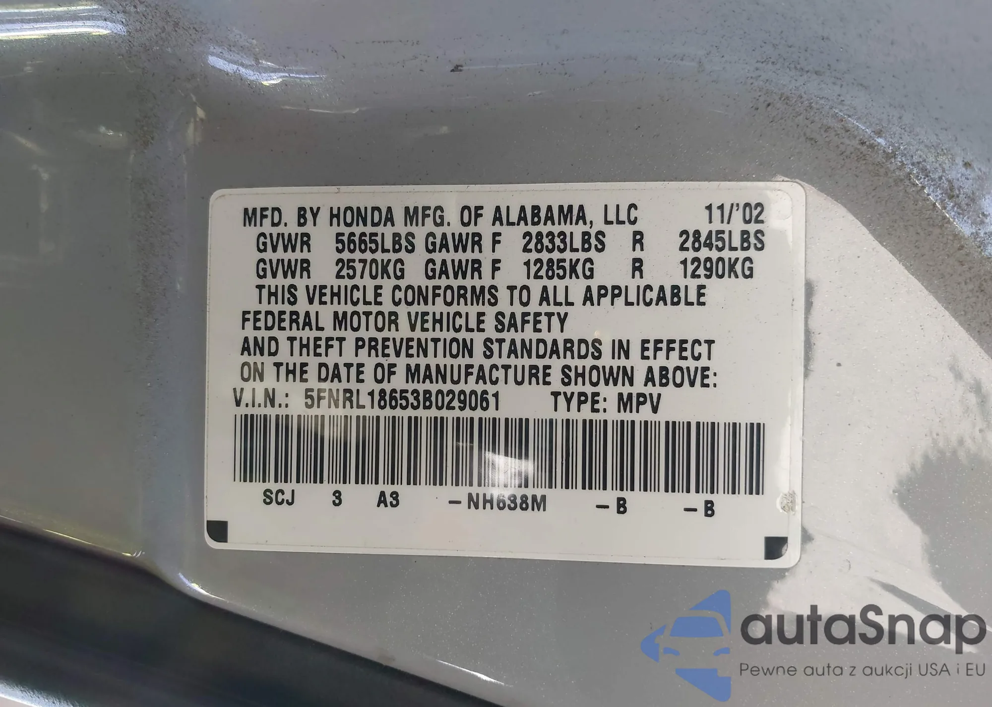 Samochód Honda Odyssey 2003 (VIN 5FNRL18653B029061) nie był wcześniej licytowany. Dokumenty są czyste, przebieg odpowiada lub jest niższy niż średnia rynku. Sprzedaje go firma ubezpieczeniowa – polecamy zakup. Dostawa do portu zajmie ok. 6–8 tygodni.