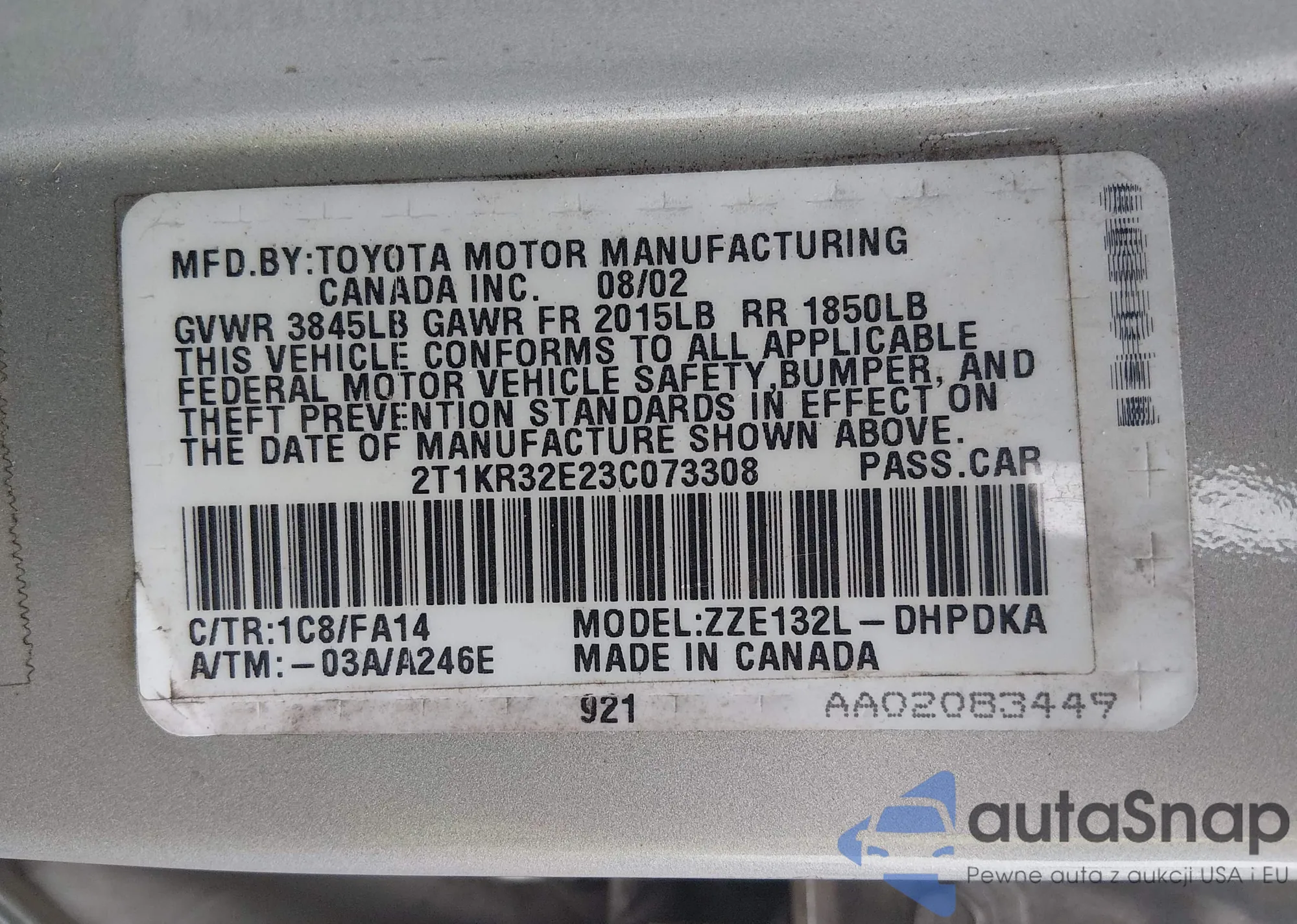 Samochód Toyota Matrix 2003 (VIN 2T1KR32E23C073308) sprzedaje go niezweryfikowany sprzedawca. Zalecamy raport Carfax i potwierdzenie możliwości rejestracji pojazdu przed zakupem.