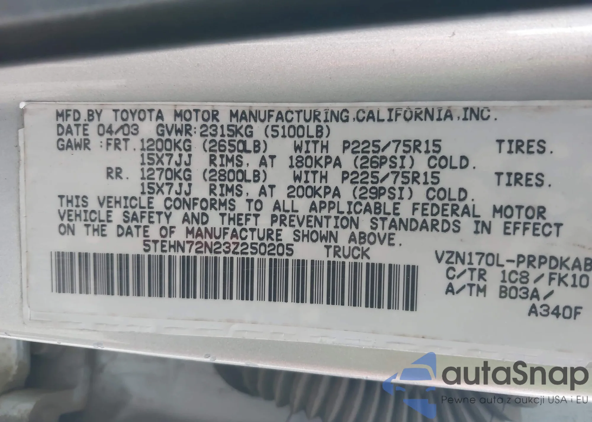 • VIN: 5TEHN72N23Z250205