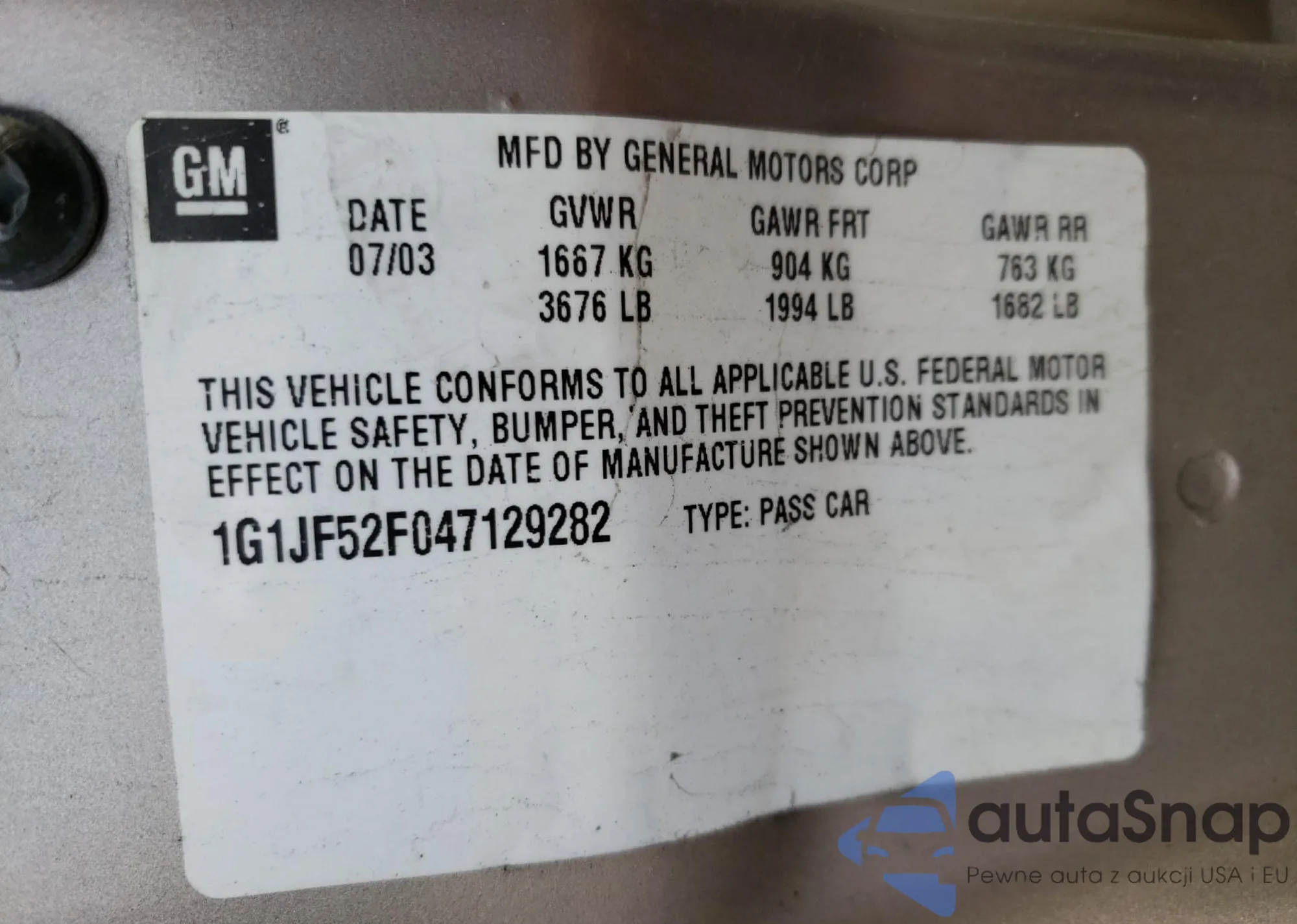 Samochód Chevrolet Cavalier 2004 (VIN 1G1JF52F047129282) ma dokumenty uniemożliwiające rejestrację. Mogą pojawić się trudności przy eksporcie i rejestracji. Skontaktuj się z ekspertami AutaSnap w celu znalezienia alternatywy.