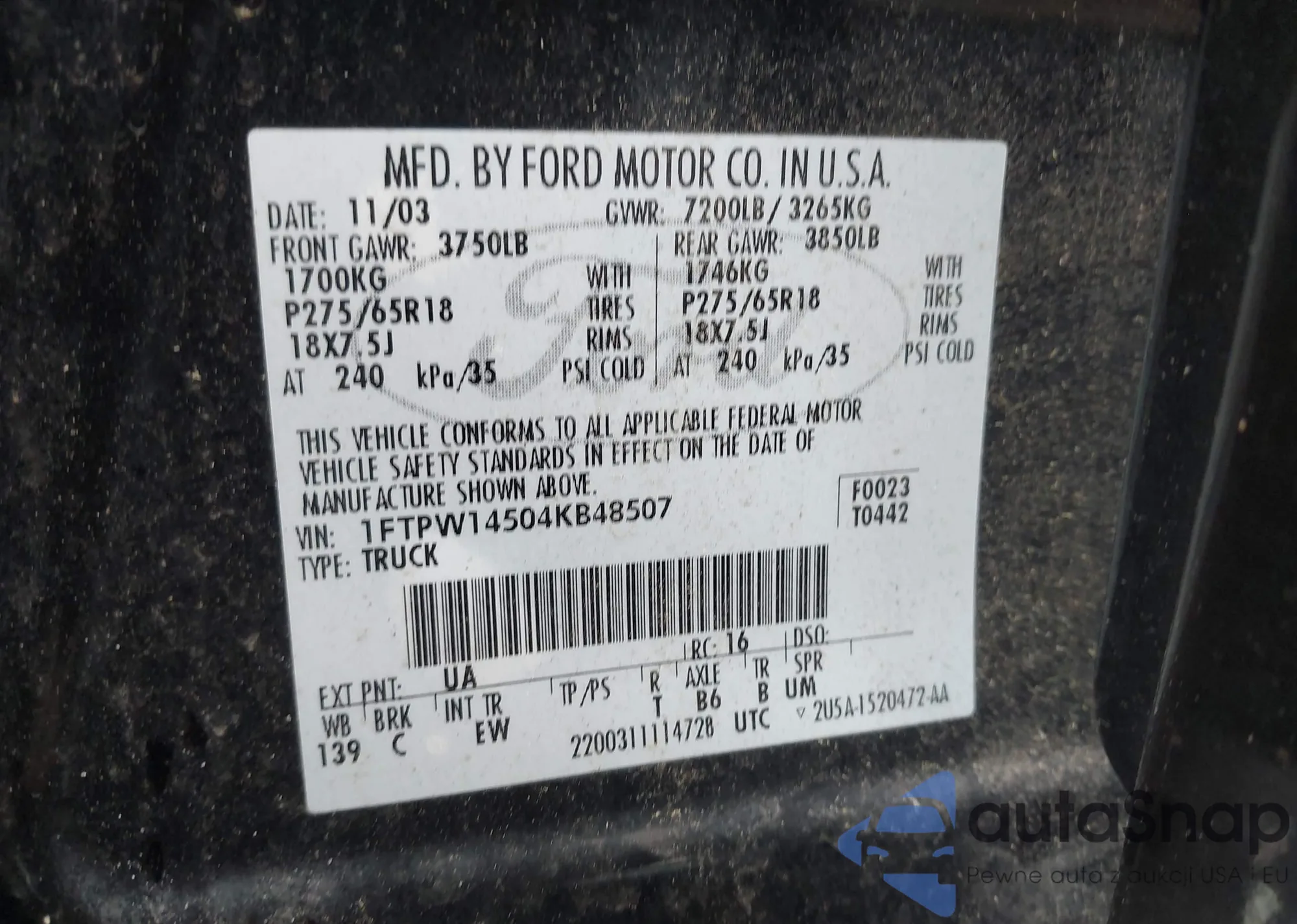 VIN: 1FTPW14504KB48507