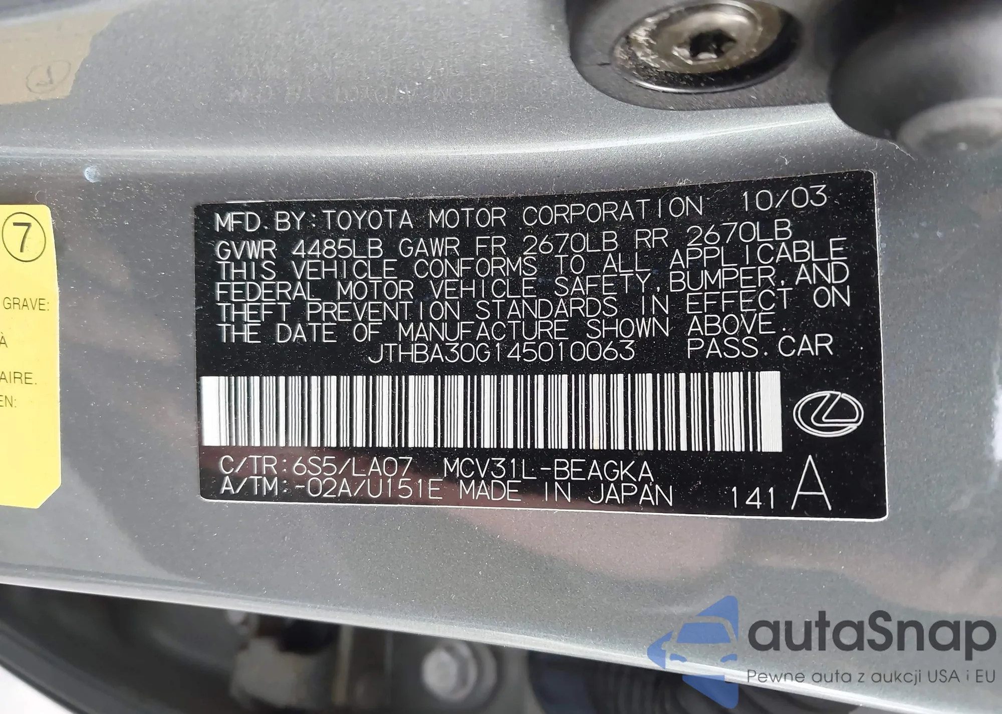 • VIN: JTHBA30G145010063