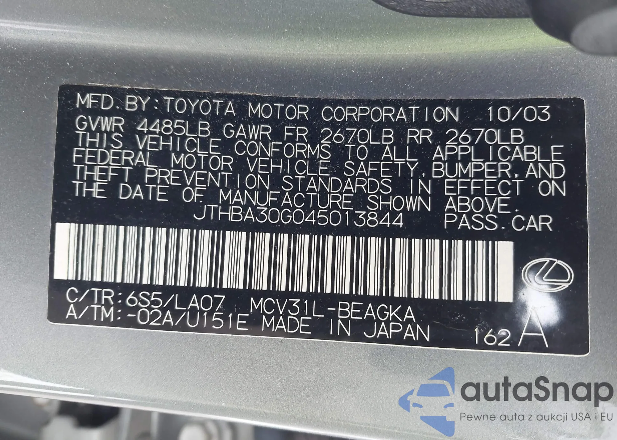 • VIN: JTHBA30G045013844