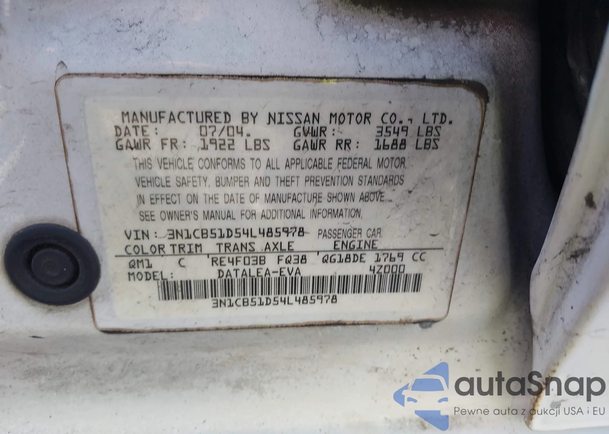 Samochód Nissan Sentra 2004 (VIN 3N1CB51D54L485978) sprzedaje go niezweryfikowany sprzedawca. Zalecamy raport Carfax i potwierdzenie możliwości rejestracji pojazdu przed zakupem.