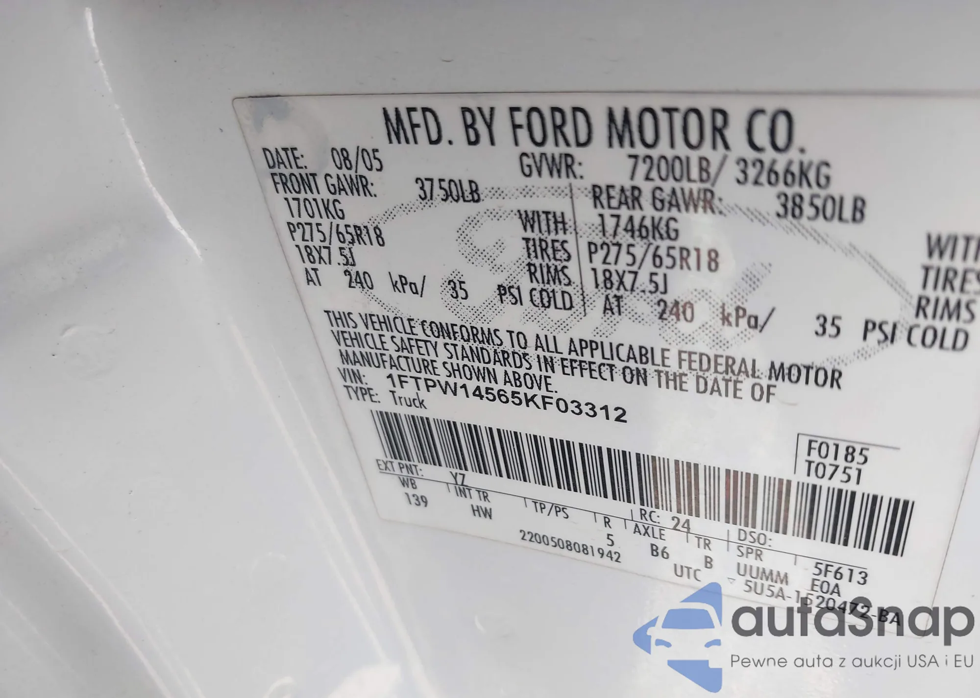 Samochód Ford F-150 2005 (VIN 1FTPW14565KF03312) nie był wcześniej licytowany. Dokumenty są czyste, przebieg odpowiada lub jest niższy niż średnia rynku. Sprzedaje go firma ubezpieczeniowa – polecamy zakup. Dostawa do portu zajmie ok. 6–8 tygodni.