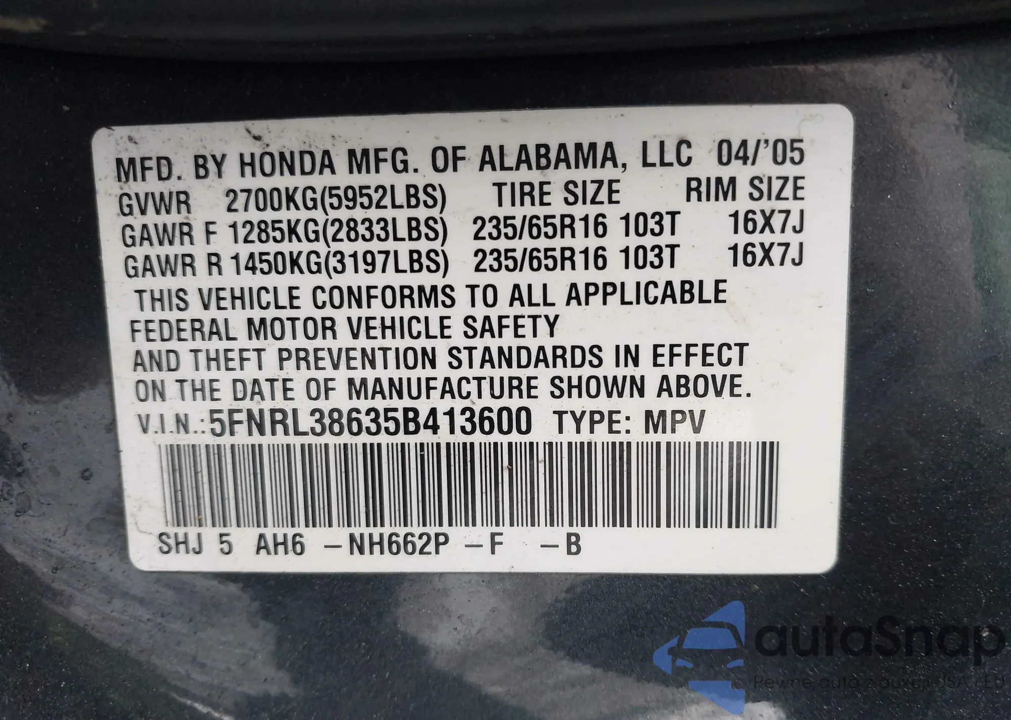 Samochód Honda Odyssey 2005 (VIN 5FNRL38635B413600) ma dokumenty uniemożliwiające rejestrację. Mogą pojawić się trudności przy eksporcie i rejestracji. Skontaktuj się z ekspertami AutaSnap w celu znalezienia alternatywy.