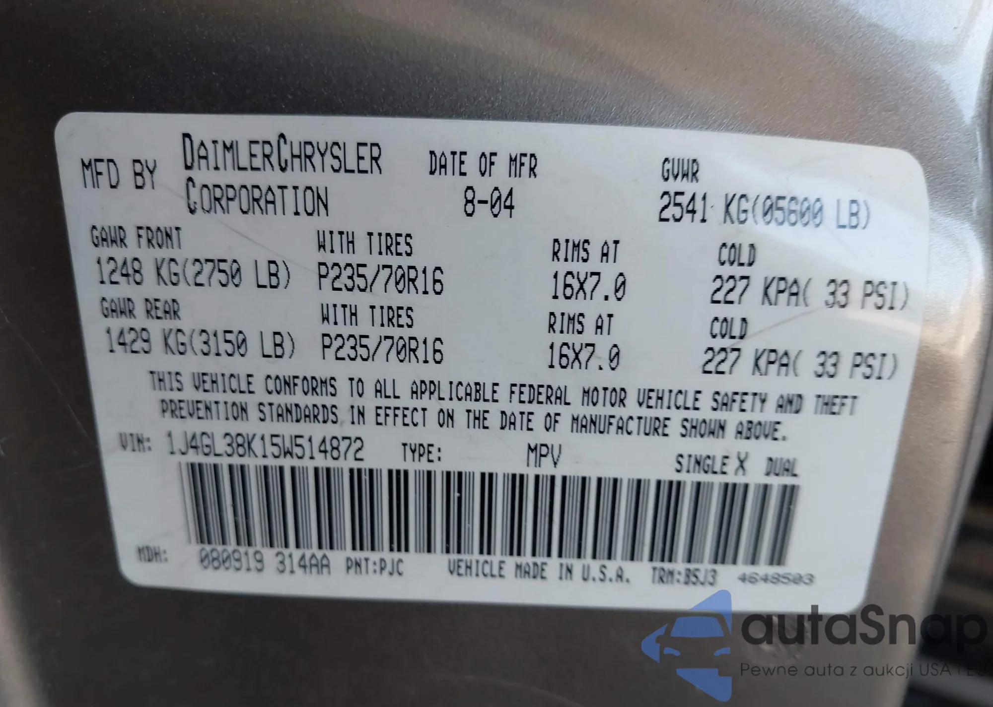 VIN: 1J4GL38K15W514872