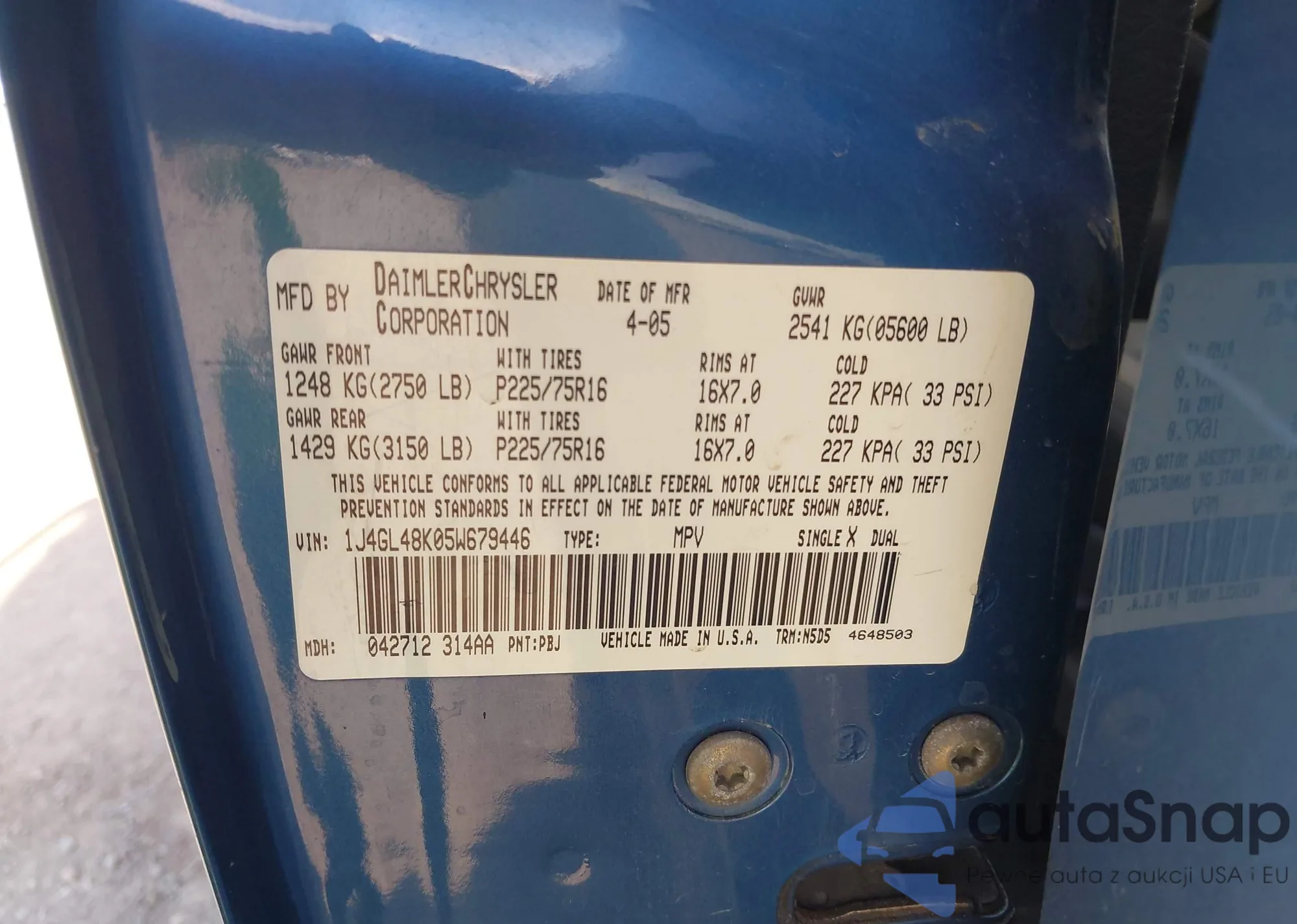 Samochód Jeep Liberty (North America) 2005 (VIN 1J4GL48K05W679446) nie był wcześniej licytowany. Dokumenty są czyste, przebieg odpowiada lub jest niższy niż średnia rynku. Sprzedaje go firma ubezpieczeniowa – polecamy zakup. Dostawa do portu zajmie ok. 6–8 tygodni.