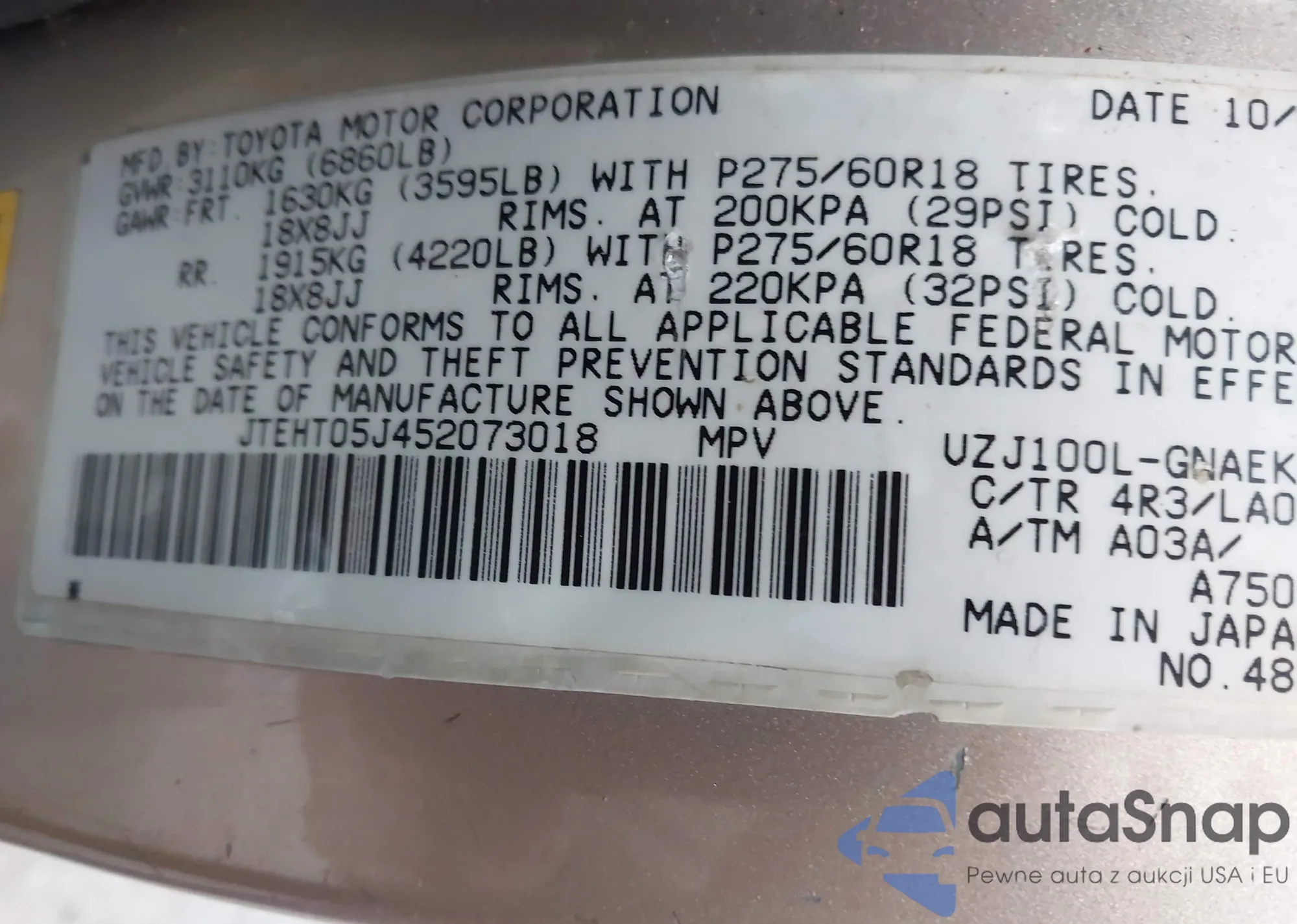 • VIN: JTEHT05J452073018