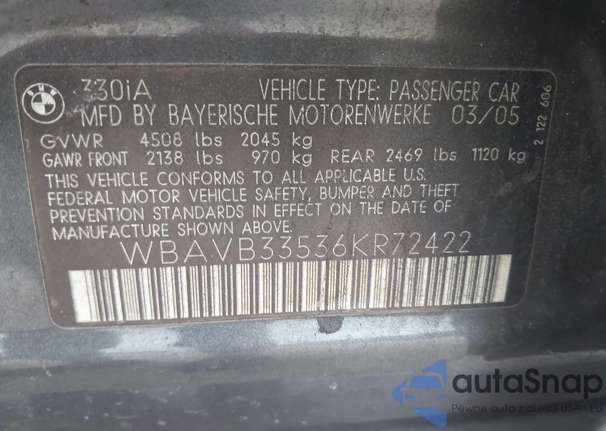 Samochód BMW 3er 2006 (VIN WBAVB33536KR72422) nie był wcześniej licytowany. Dokumenty są czyste, przebieg odpowiada lub jest niższy niż średnia rynku. Sprzedaje go firma ubezpieczeniowa – polecamy zakup. Dostawa do portu zajmie ok. 6–8 tygodni.