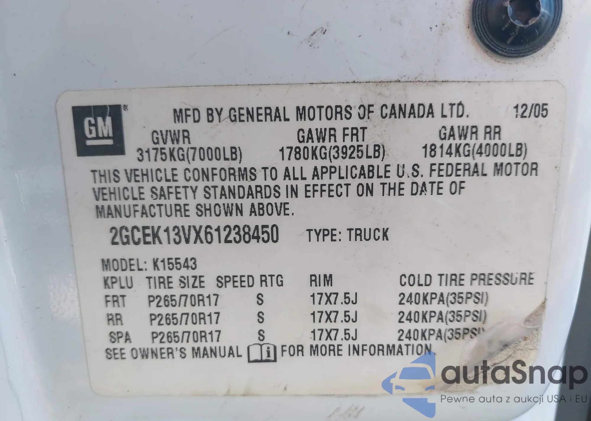 Samochód Chevrolet Silverado 2006 (VIN 2GCEK13VX61238450) nie był wcześniej licytowany. Dokumenty są czyste, przebieg odpowiada lub jest niższy niż średnia rynku. Sprzedaje go firma ubezpieczeniowa – polecamy zakup. Dostawa do portu zajmie ok. 6–8 tygodni.