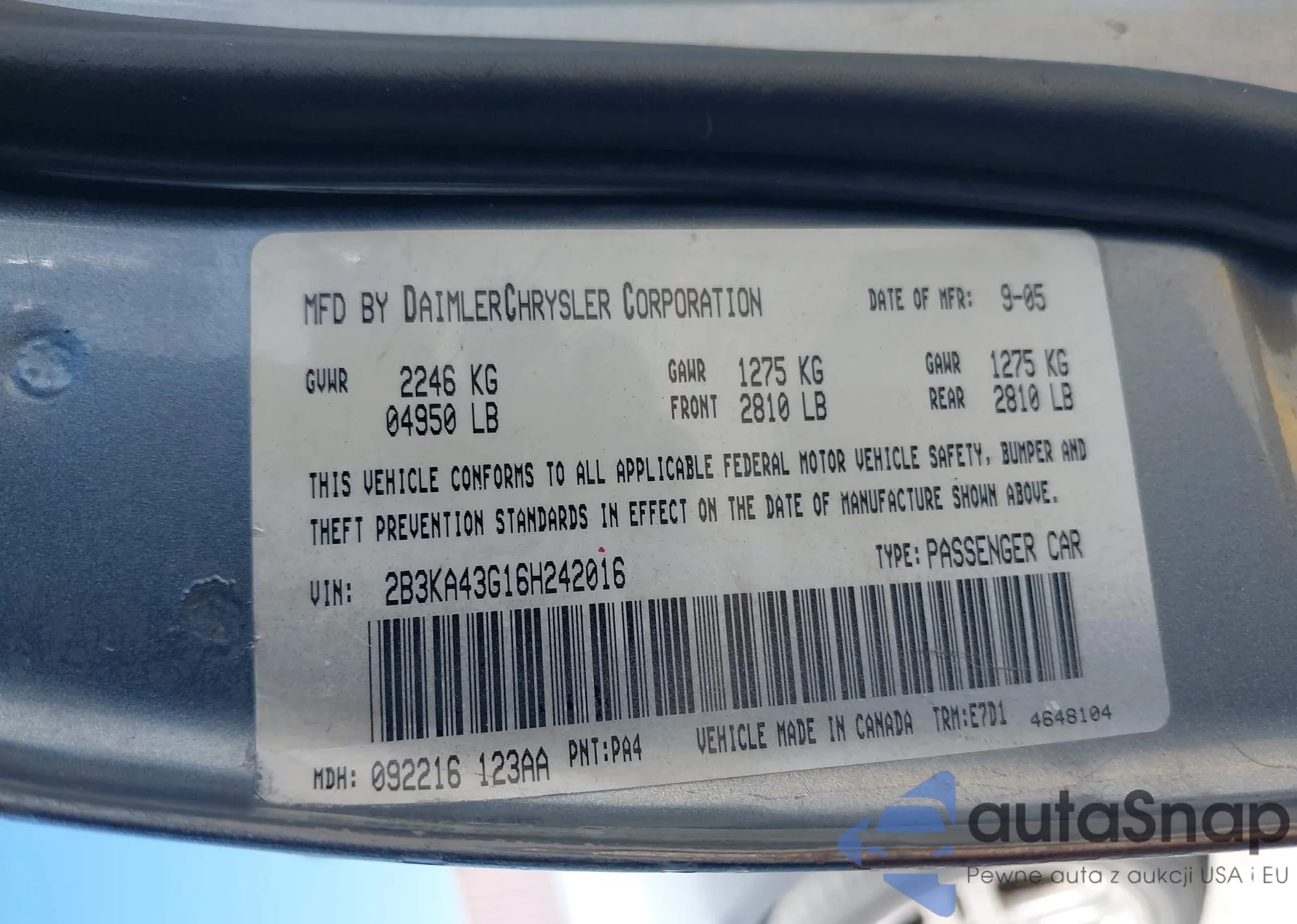• VIN: 2B3KA43G16H242016